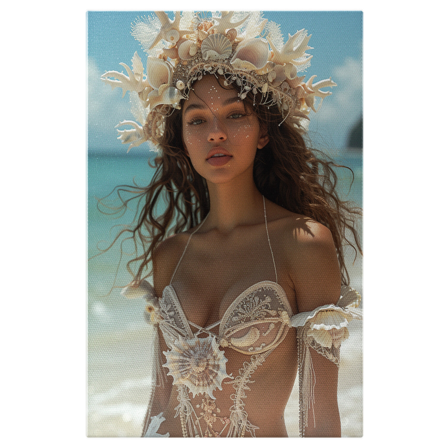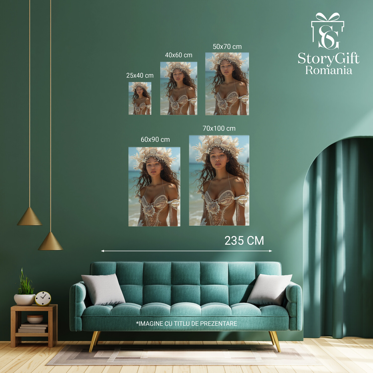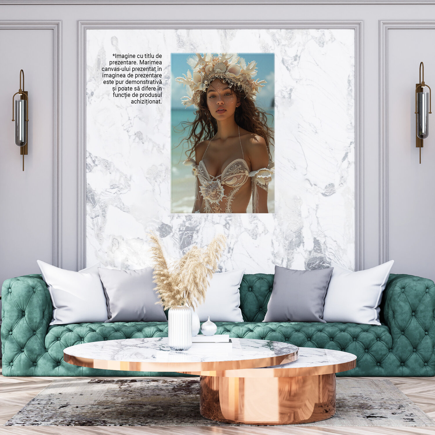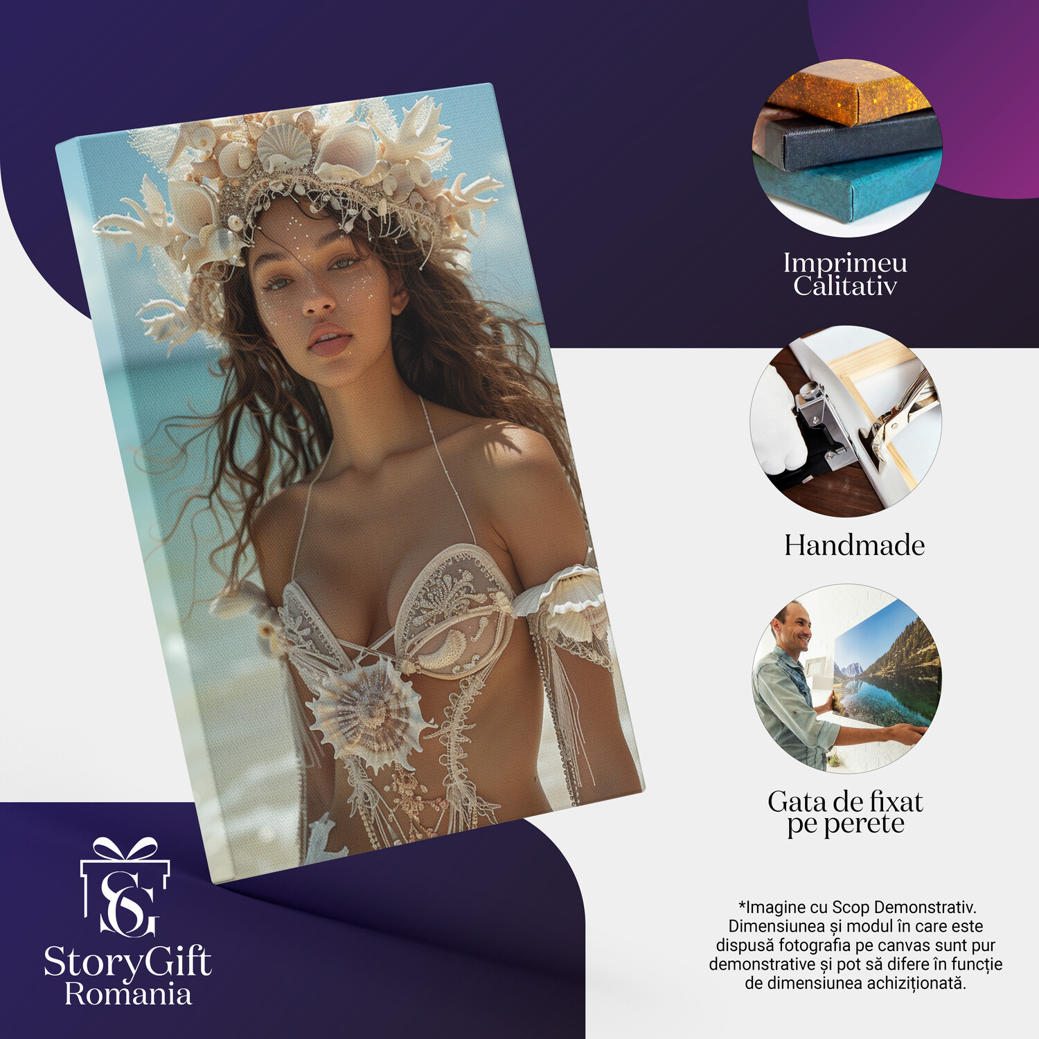 Tablou Canvas Costumul Atragator al Brunetei cu Scoici in Par Plimbare pe Plaja , Pictura Digitala - Tablou Canvas Signature de la StoryGift Romania