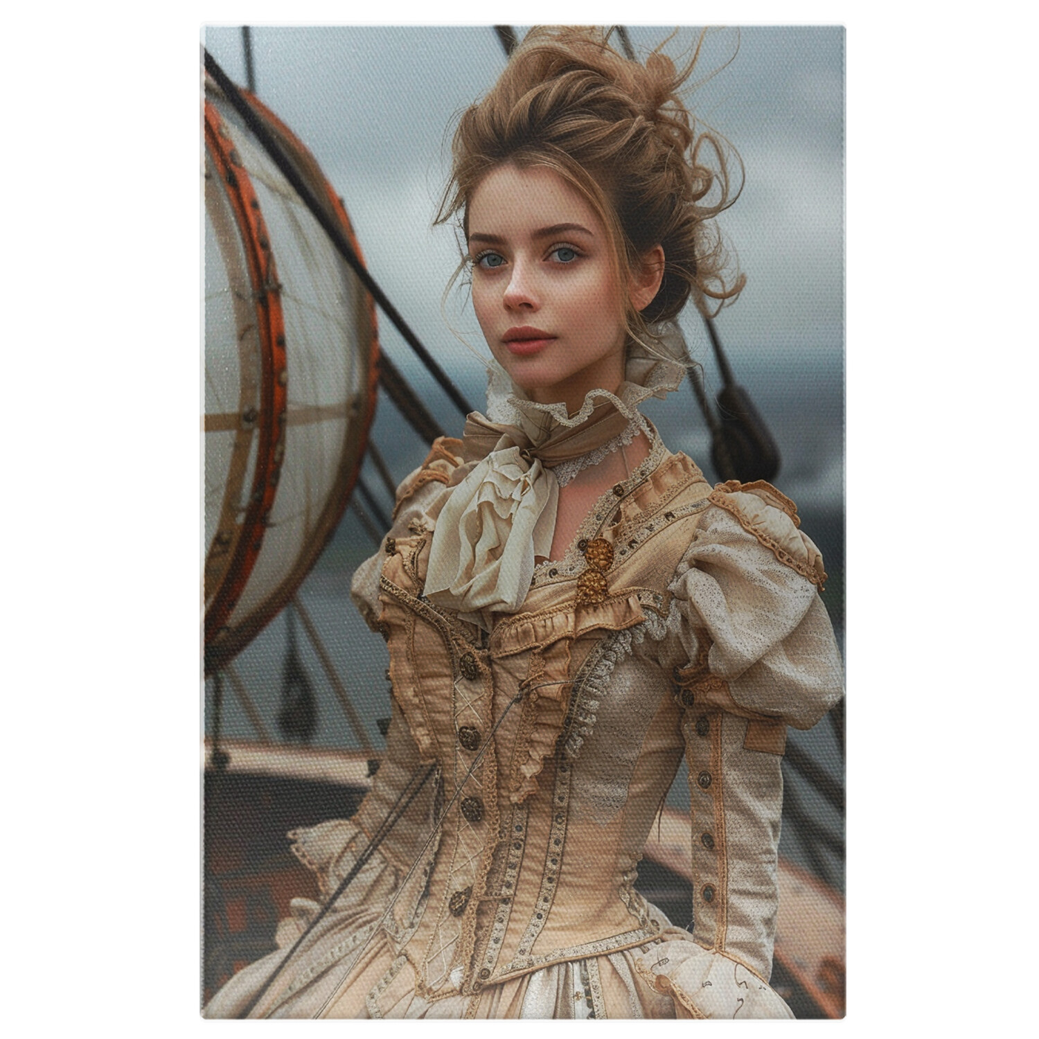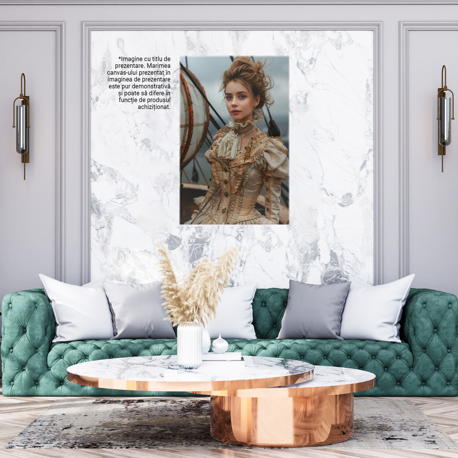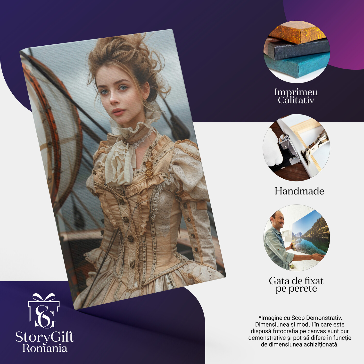 Tablou Canvas Domnita Frumoasa cu Parul Blond si Ochii Albastri in Rochie Cream cu Corset pe un Vapor , Pictura Digitala - Tablou Canvas Signature de la StoryGift Romania