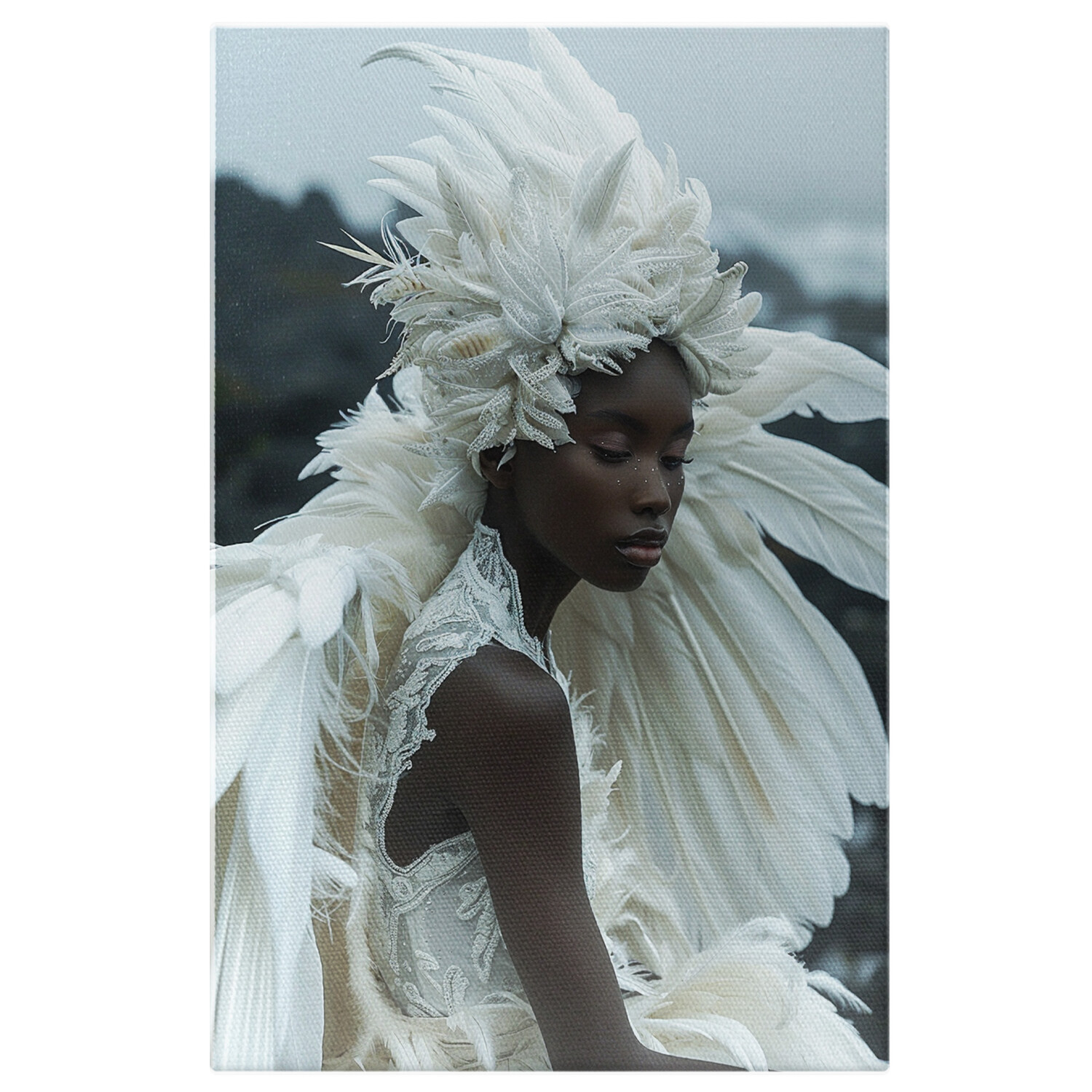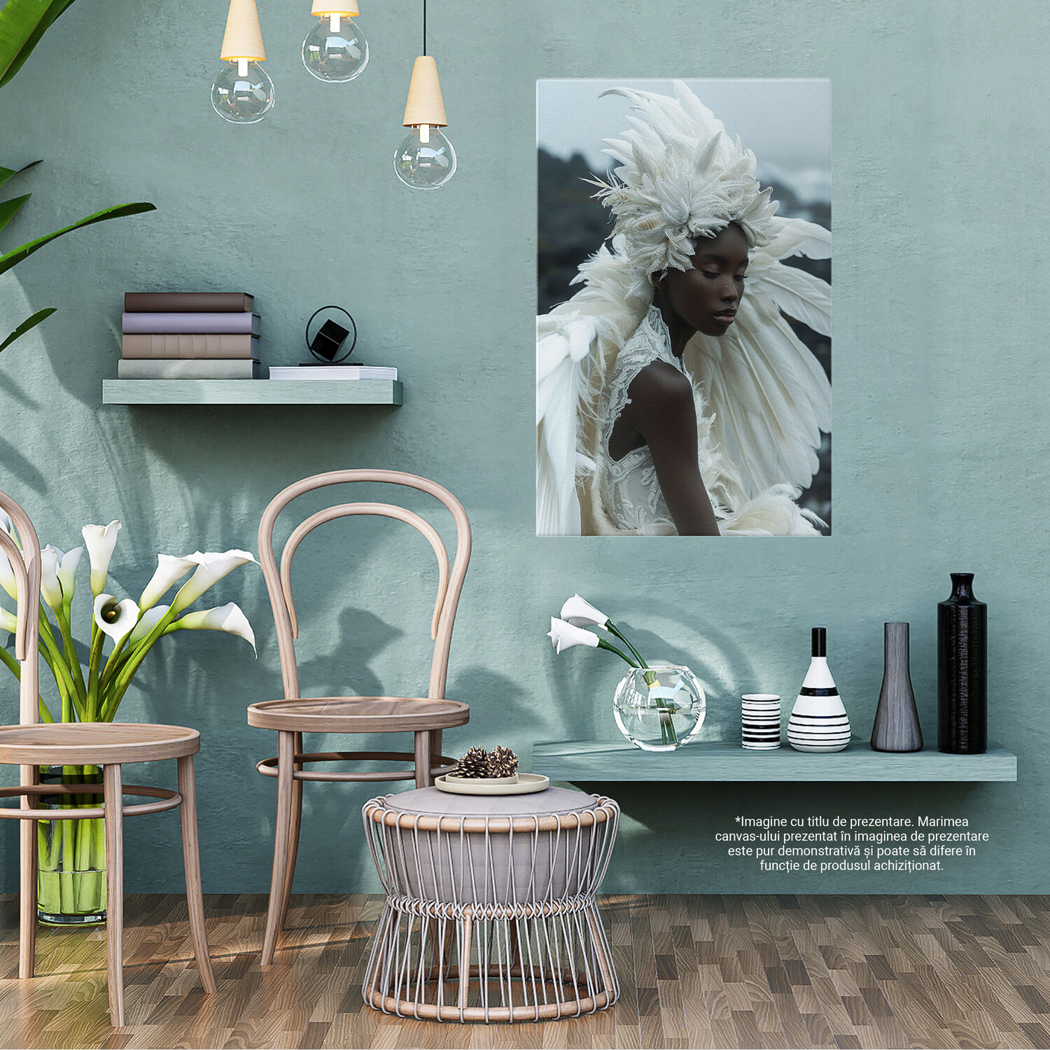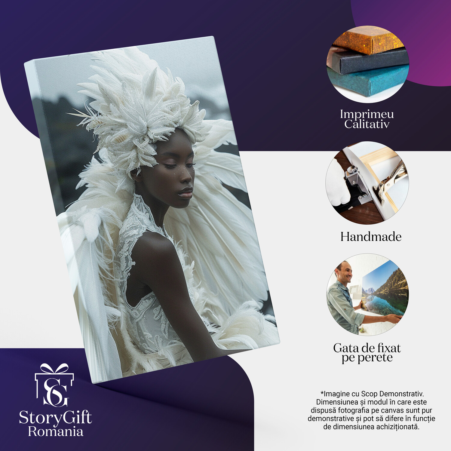 Tablou Canvas: Elemente vestimentare construite din pene - Contrast de frumuste alb-negru Pictura Digitala - Tablou Canvas Signature de la StoryGift Romania