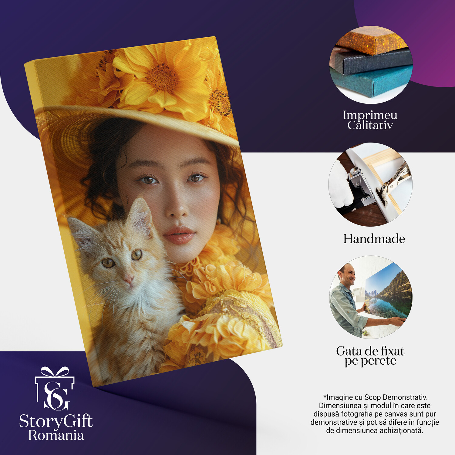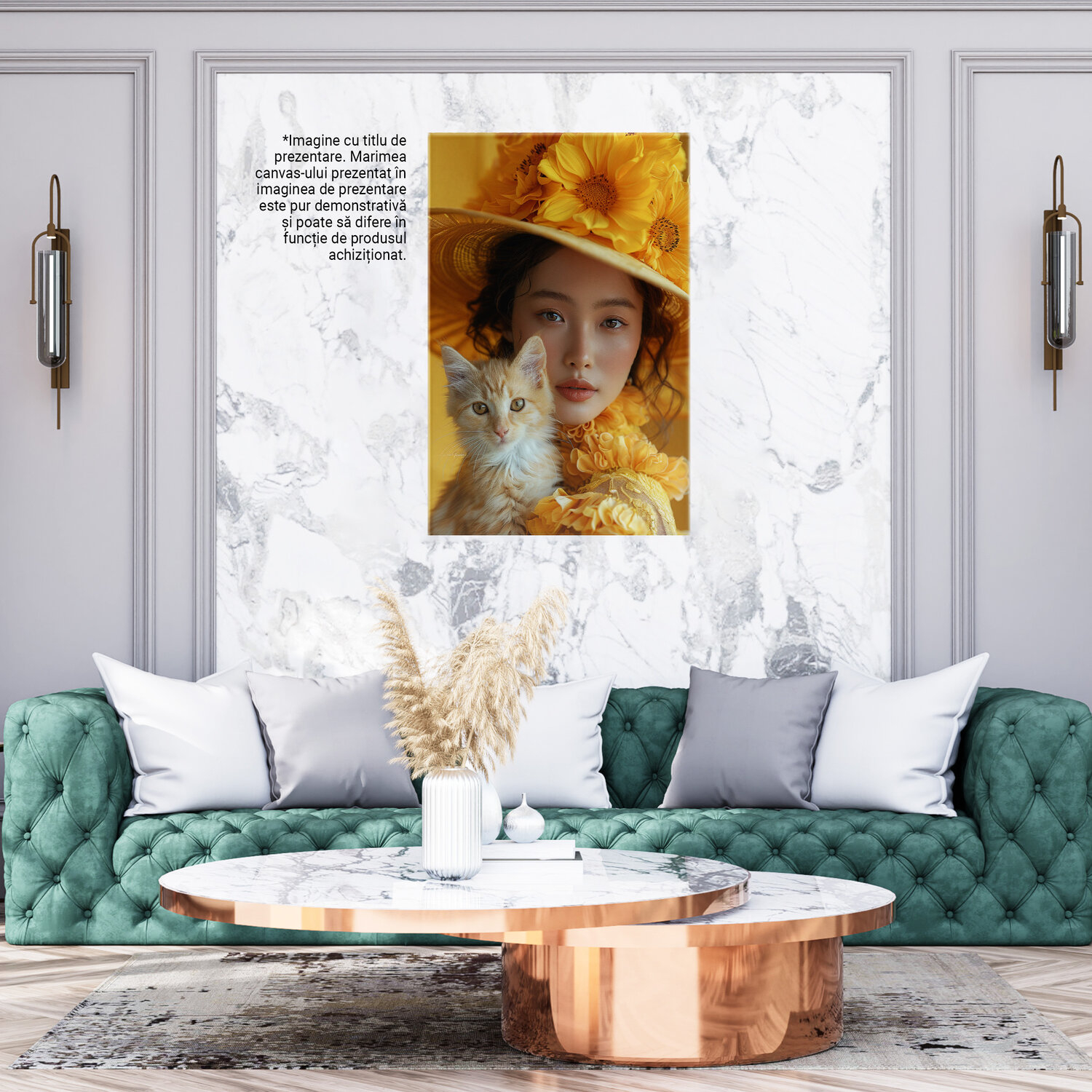 Tablou Canvas Fata Asiatica cu o Pisicuta Alba-Bej in Brate Imbracata in Rochie Galbena si Palarie cu Flori , Pictura Digitala - Tablou Canvas Signature de la StoryGift Romania