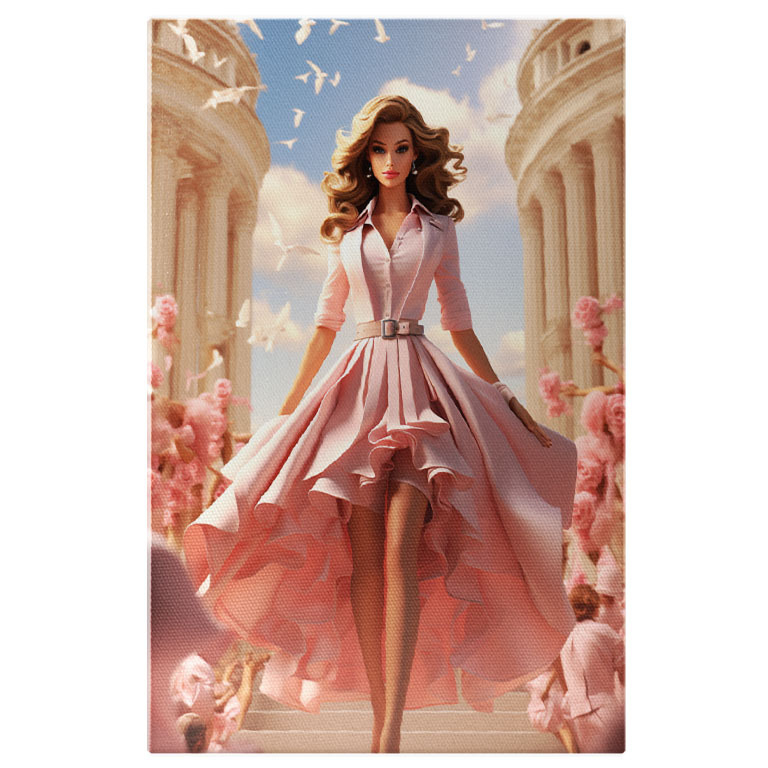 Tablou Canvas: Papusa pe Scari in Fusta Lunga cu Volane si Porumbei cu Trandafiri si Oameni in jur Pictura Digitala 40x25CM