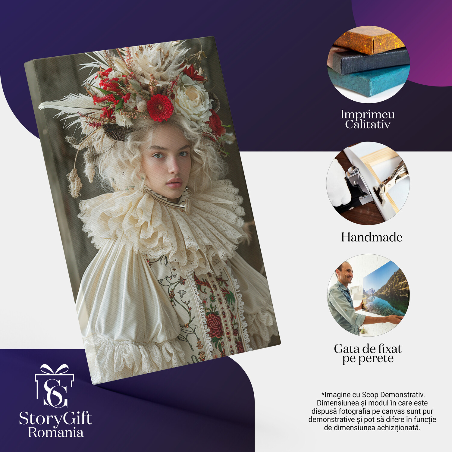 Tablou Canvas Fata in Costum Alb cu Motive Florale cu Buzele Mari si Flori cu Pene Prinse in Parul Alb , Pictura Digitala - Tablou Canvas Signature de la StoryGift Romania