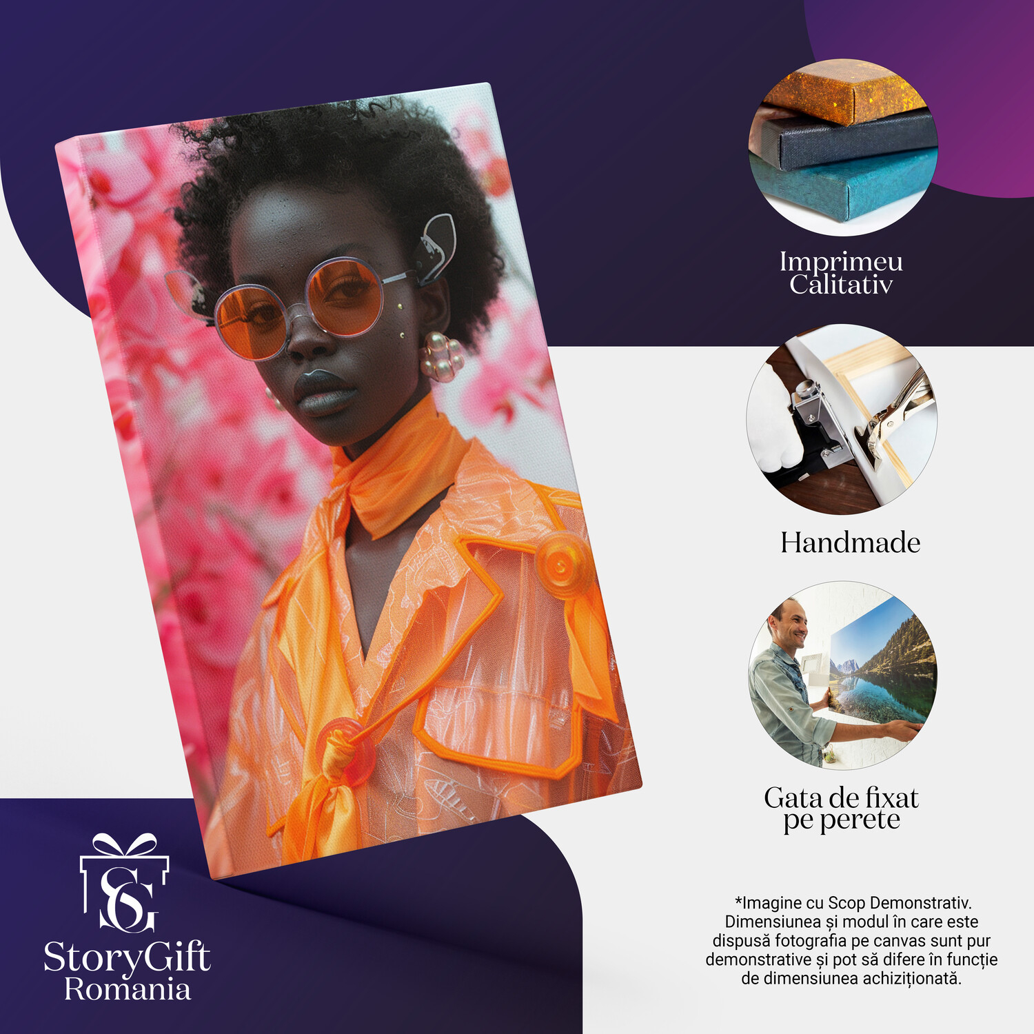 Tablou Canvas: Femeie Africana in Costum Portocaliu cu Par Cret Brunet si Cercei cu Esarfa la Gat Pictura Digitala - Tablou Canvas Signature de la StoryGift Romania