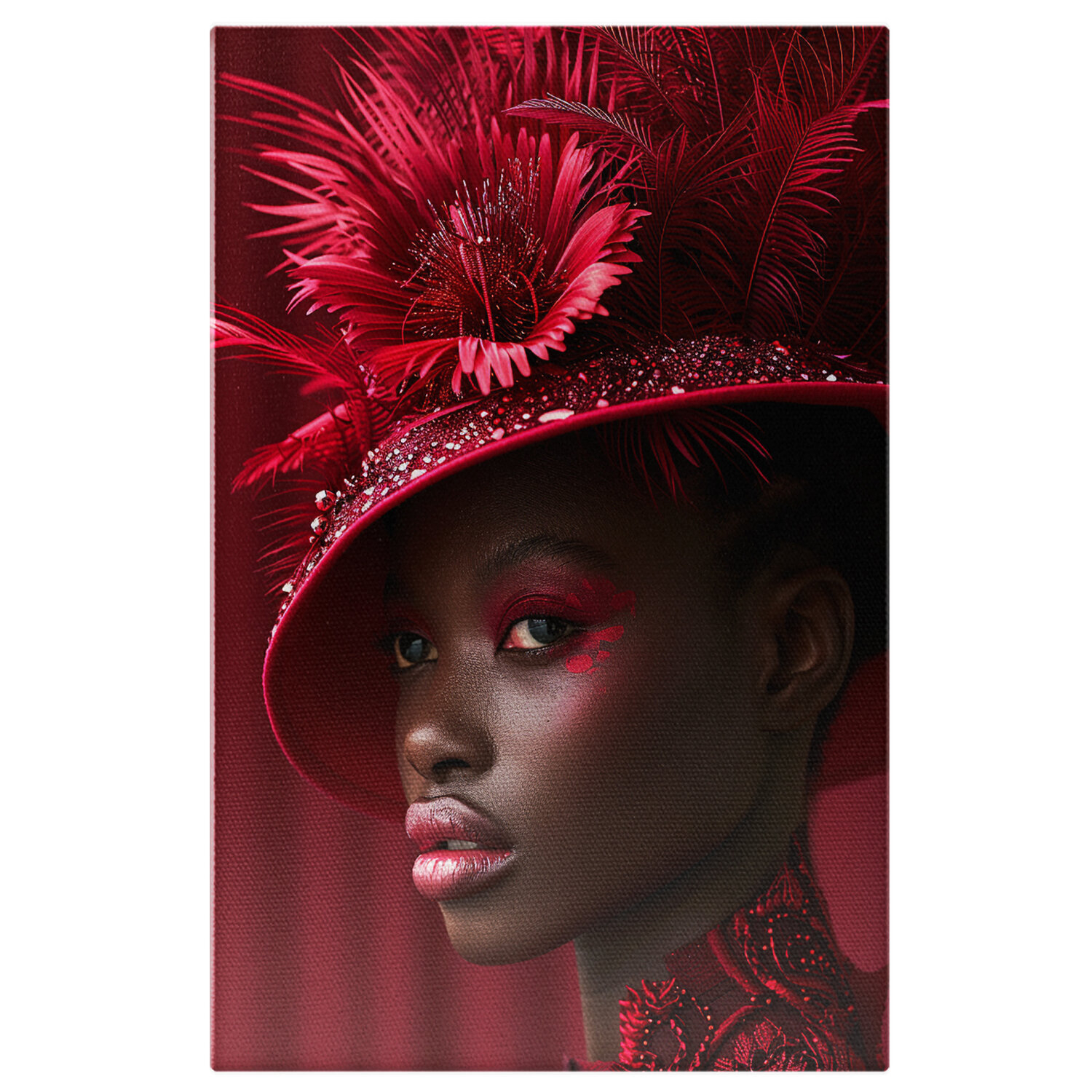 Tablou Canvas Femeie cu Ochii Machiati si Palarie cu Pene si Margele in Costum Elegant cu Buze Mari , Pictura Digitala - Tablou Canvas Signature de la StoryGift Romania