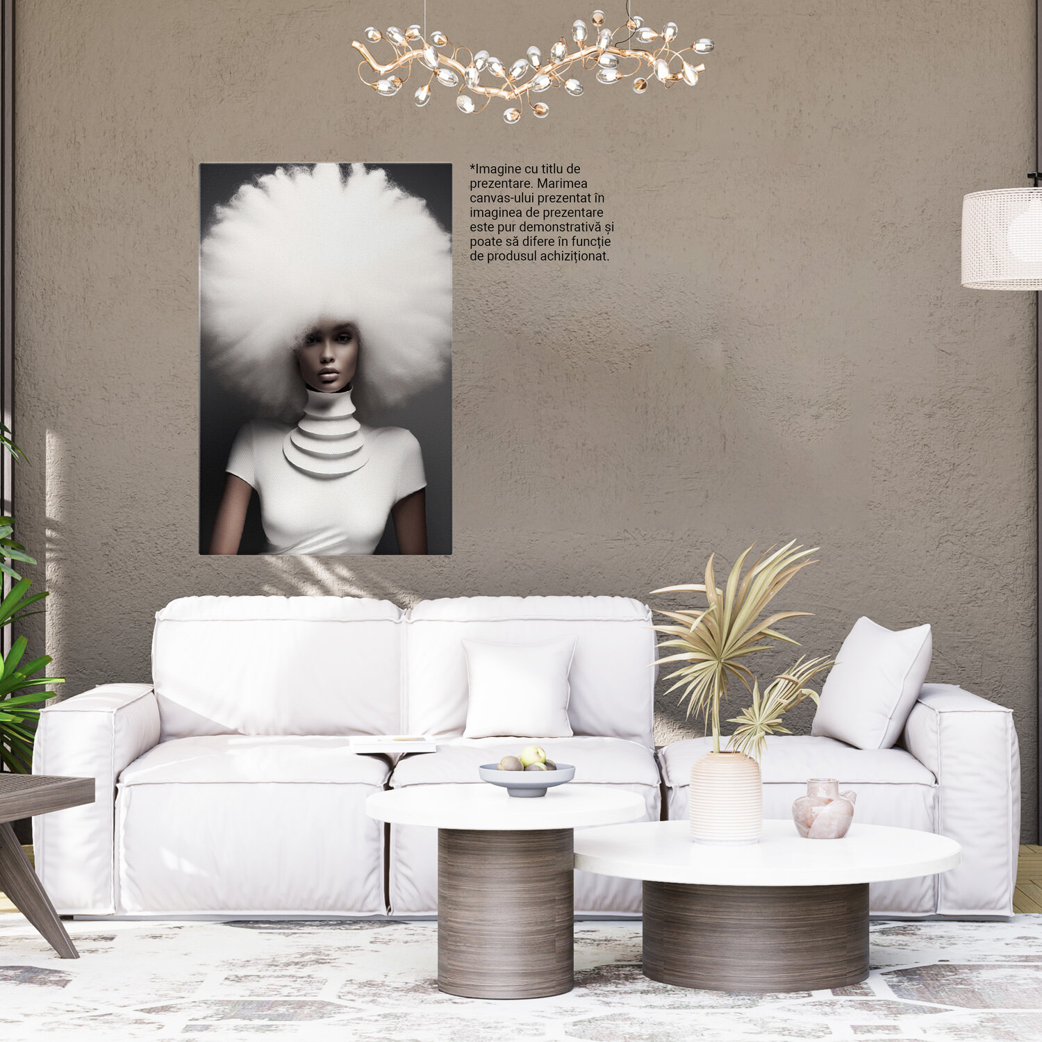 Tablou Canvas: Femeie cu Parul Voluminos Alb si Fundalul Intunecat Gri in Bluza Alba cu Model la Gat Pictura Digitala 40x25CM
