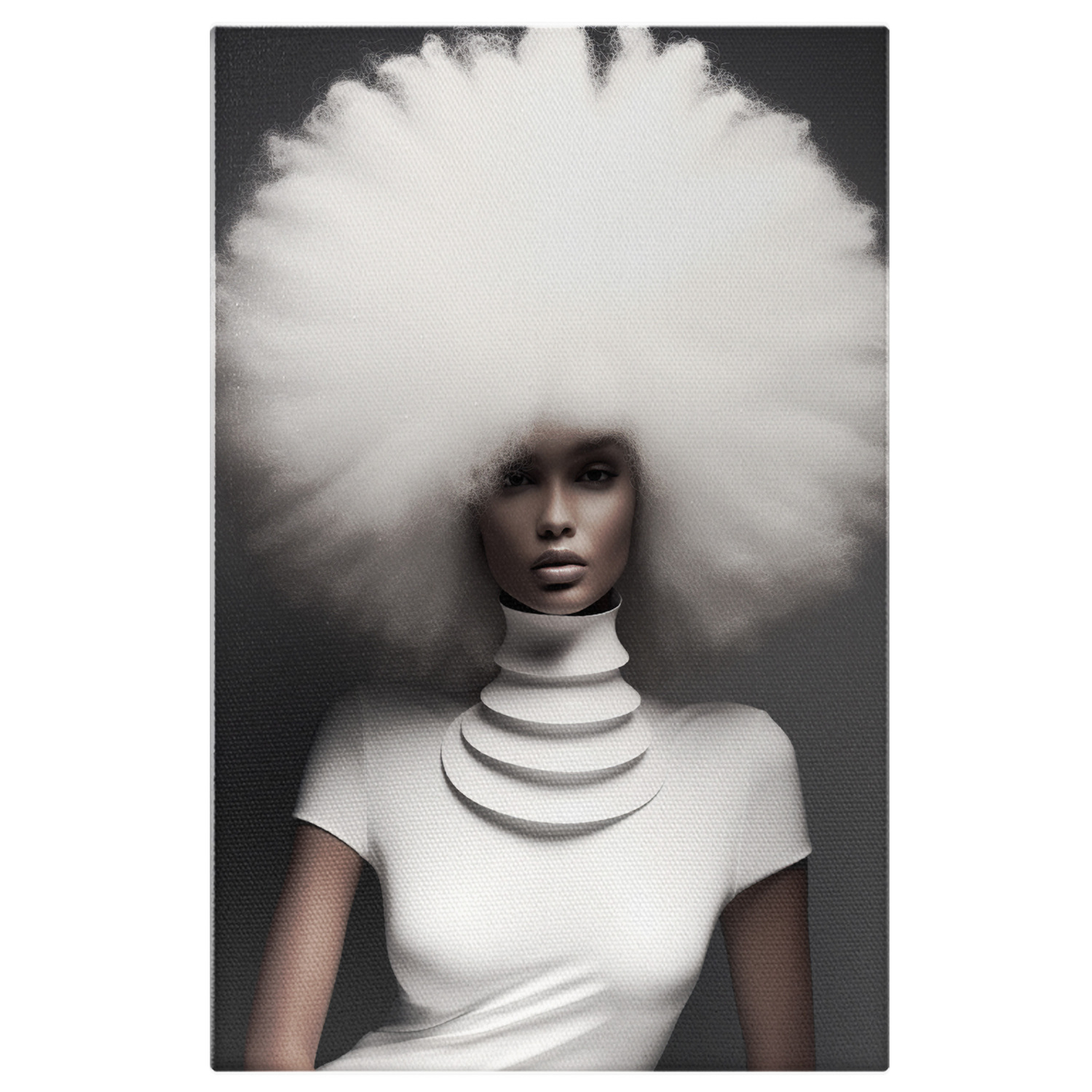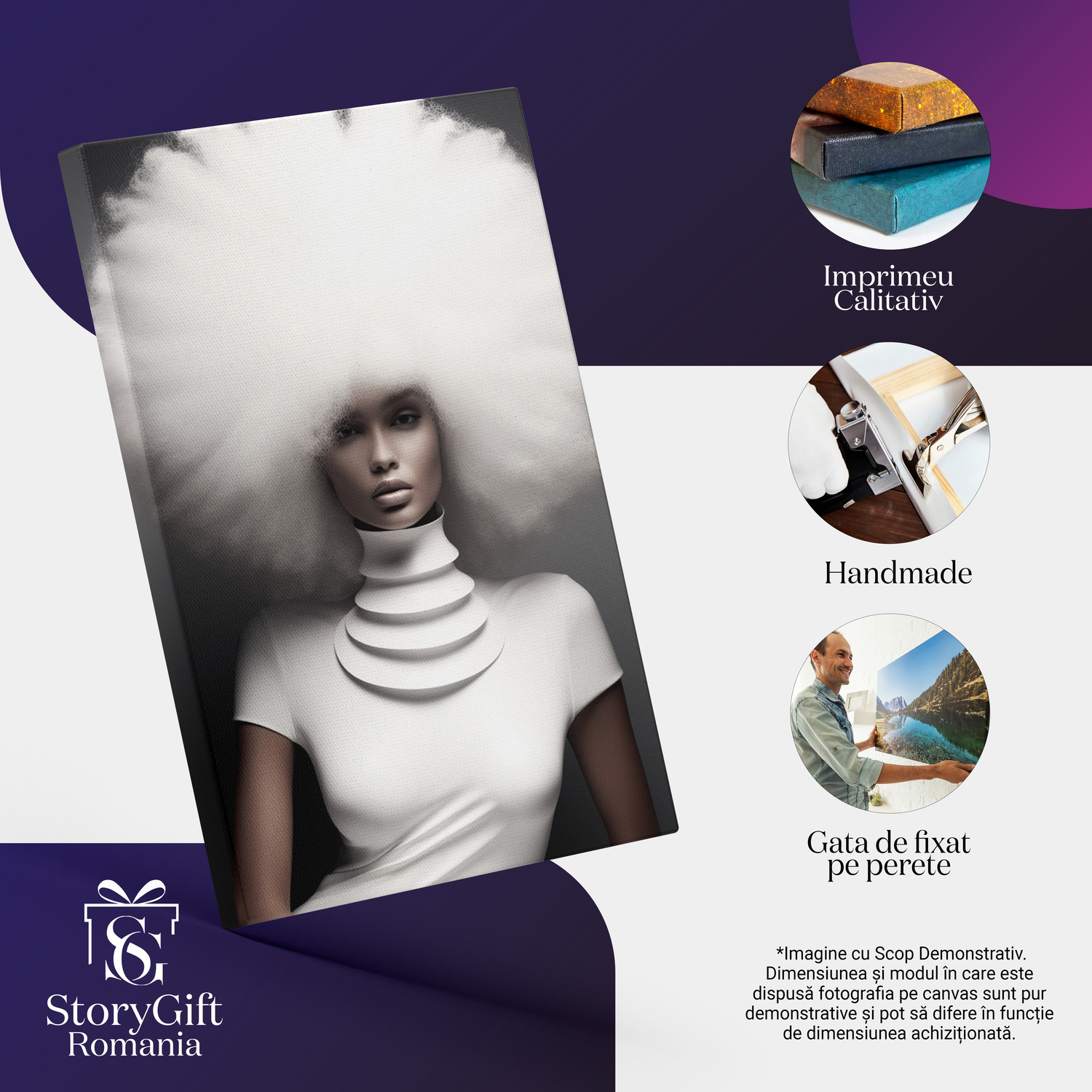 Tablou Canvas: Femeie cu Parul Voluminos Alb si Fundalul Intunecat Gri in Bluza Alba cu Model la Gat Pictura Digitala - Tablou Canvas Signature de la StoryGift Romania