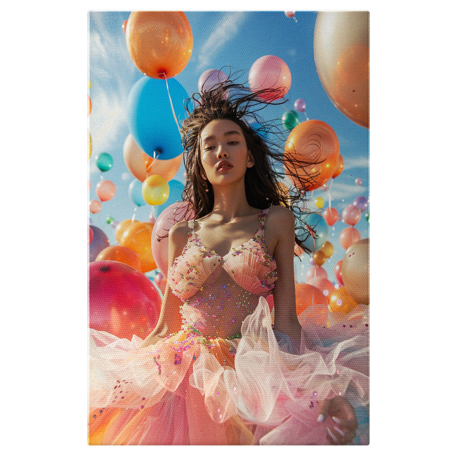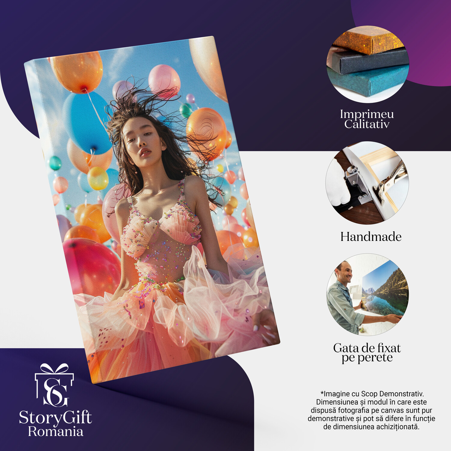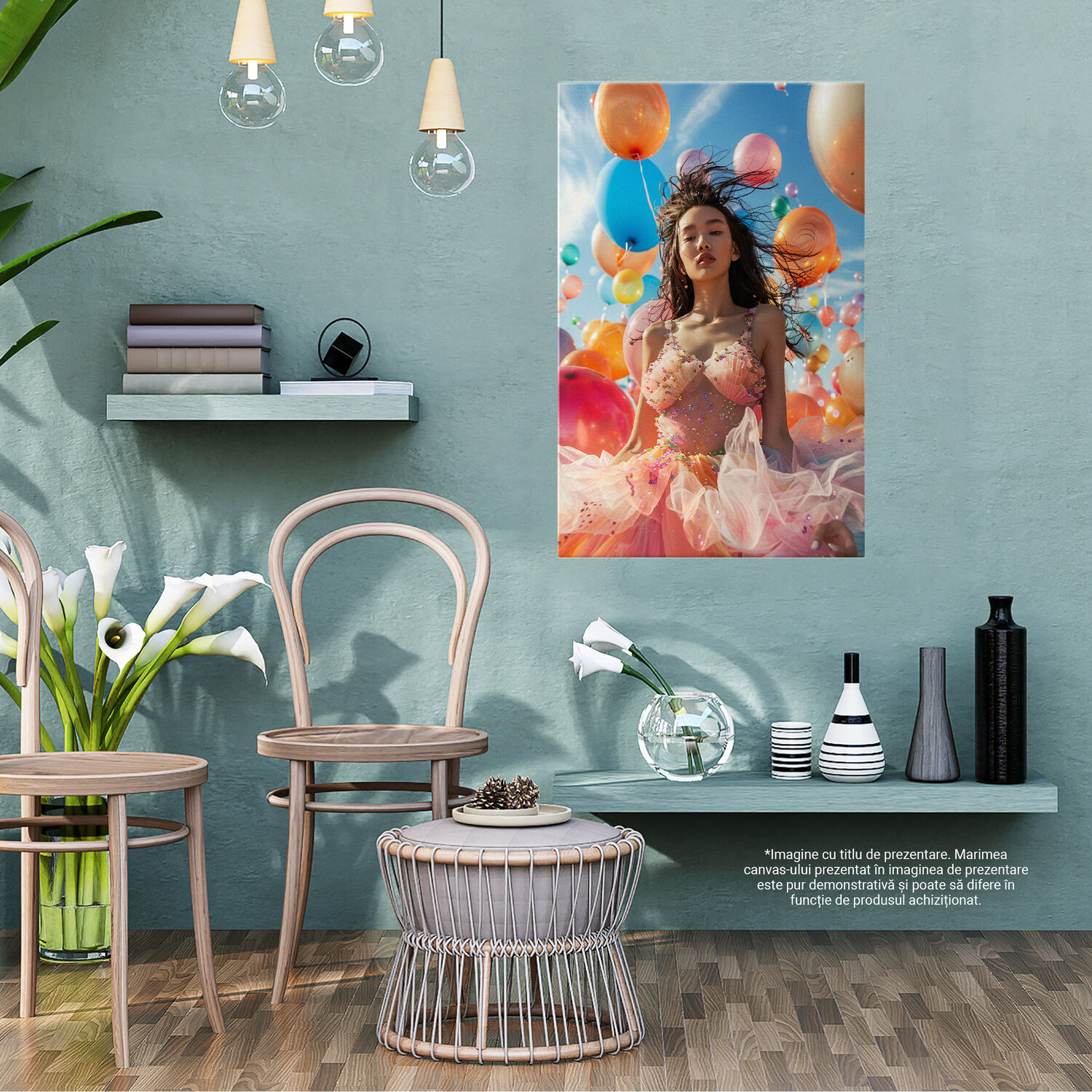 Tablou Canvas: Femeie cu rochie tutu roz intr-o mare de baloane - Asiatica intr-o lume de baloane Pictura Digitala - Tablou Canvas Signature de la StoryGift Romania