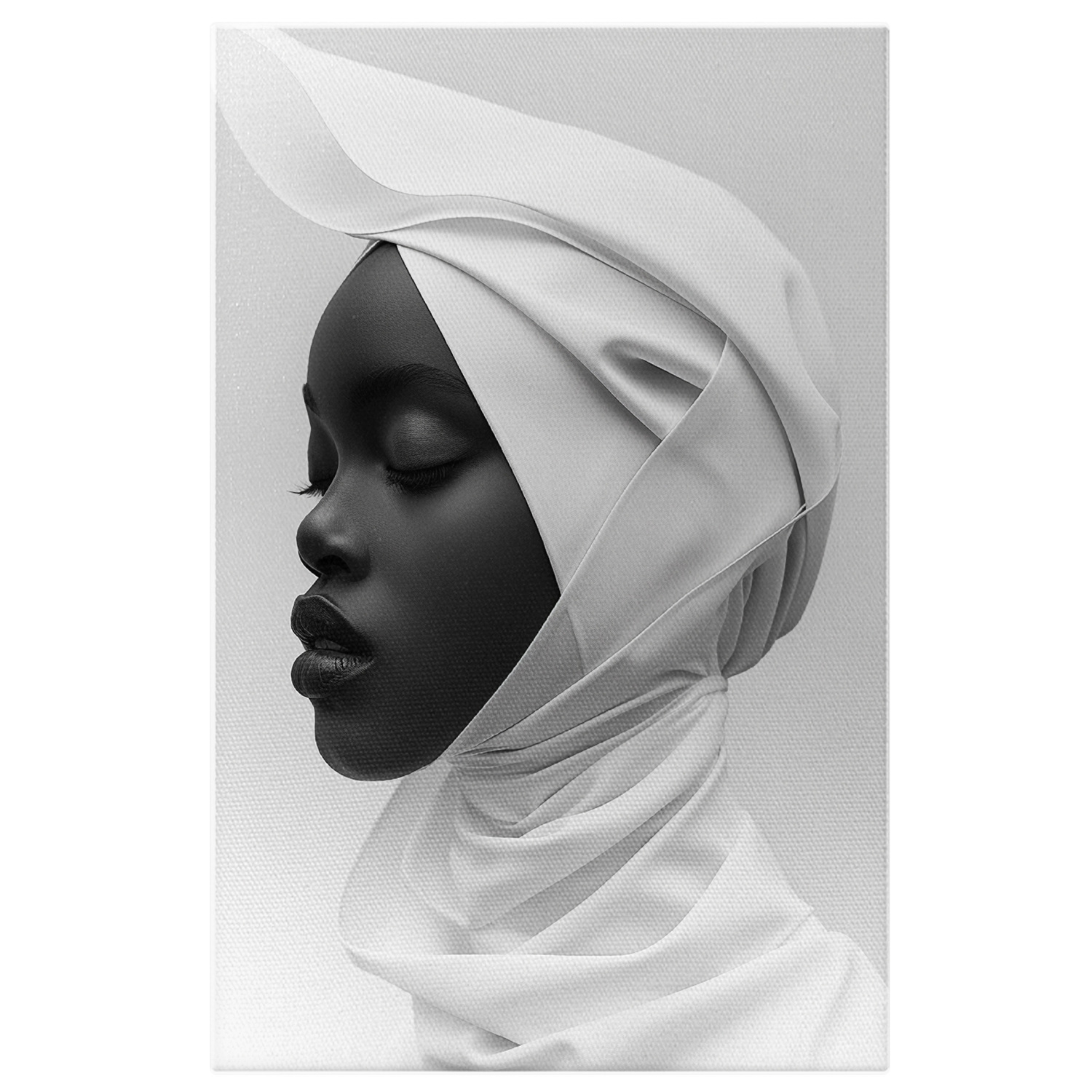 Tablou Canvas Femeie Imbracata in Alb cu Buzele Mari si Ochii Inchisi cu Parul Acoperit in Fundal Alb , Pictura Digitala - Tablou Canvas Signature de la StoryGift Romania