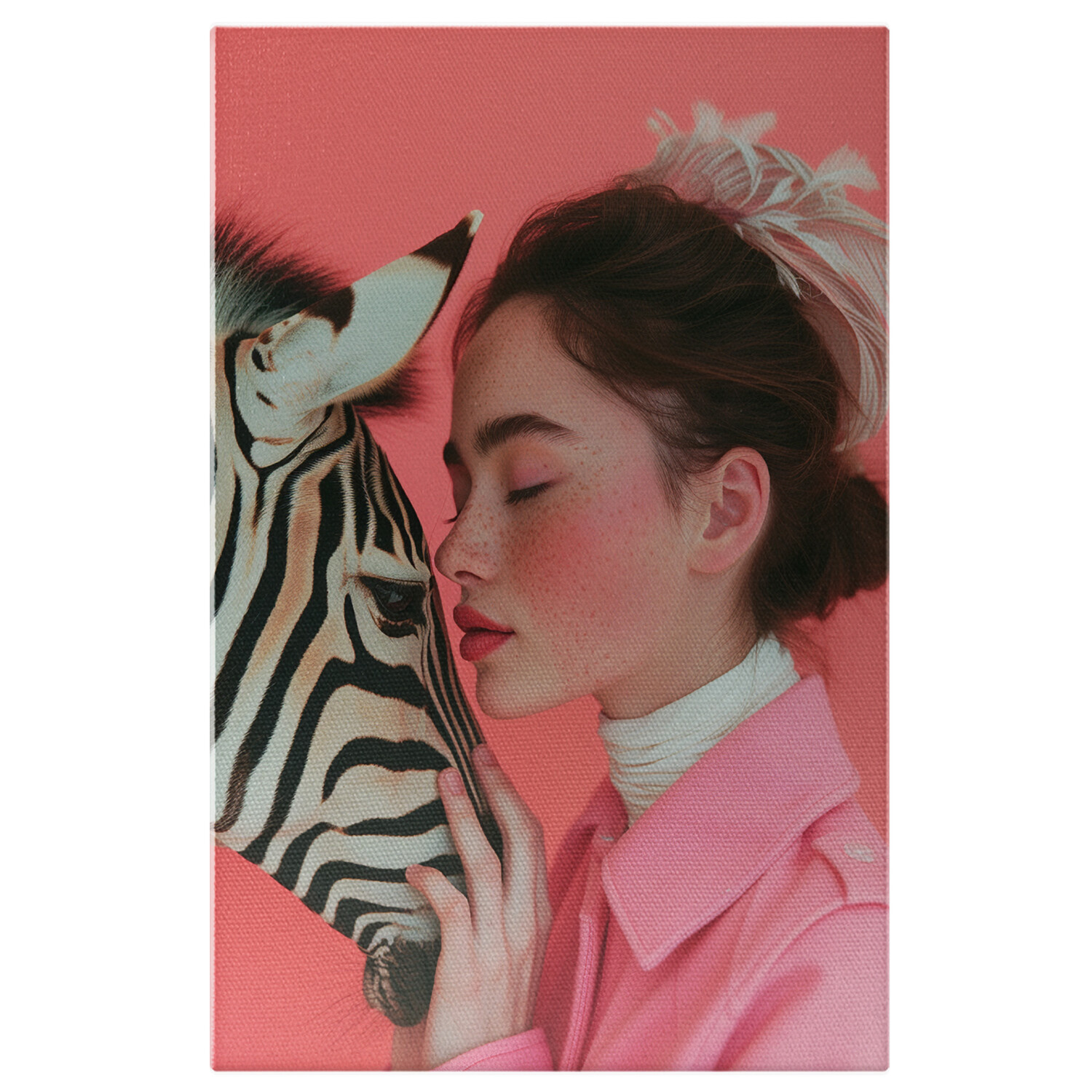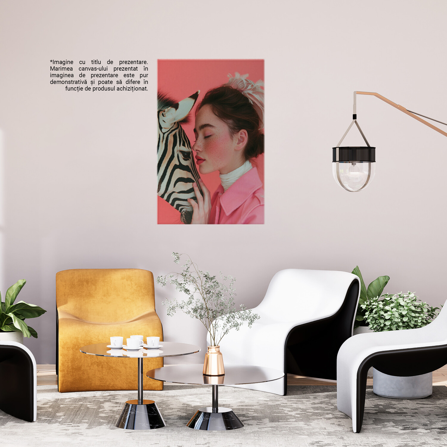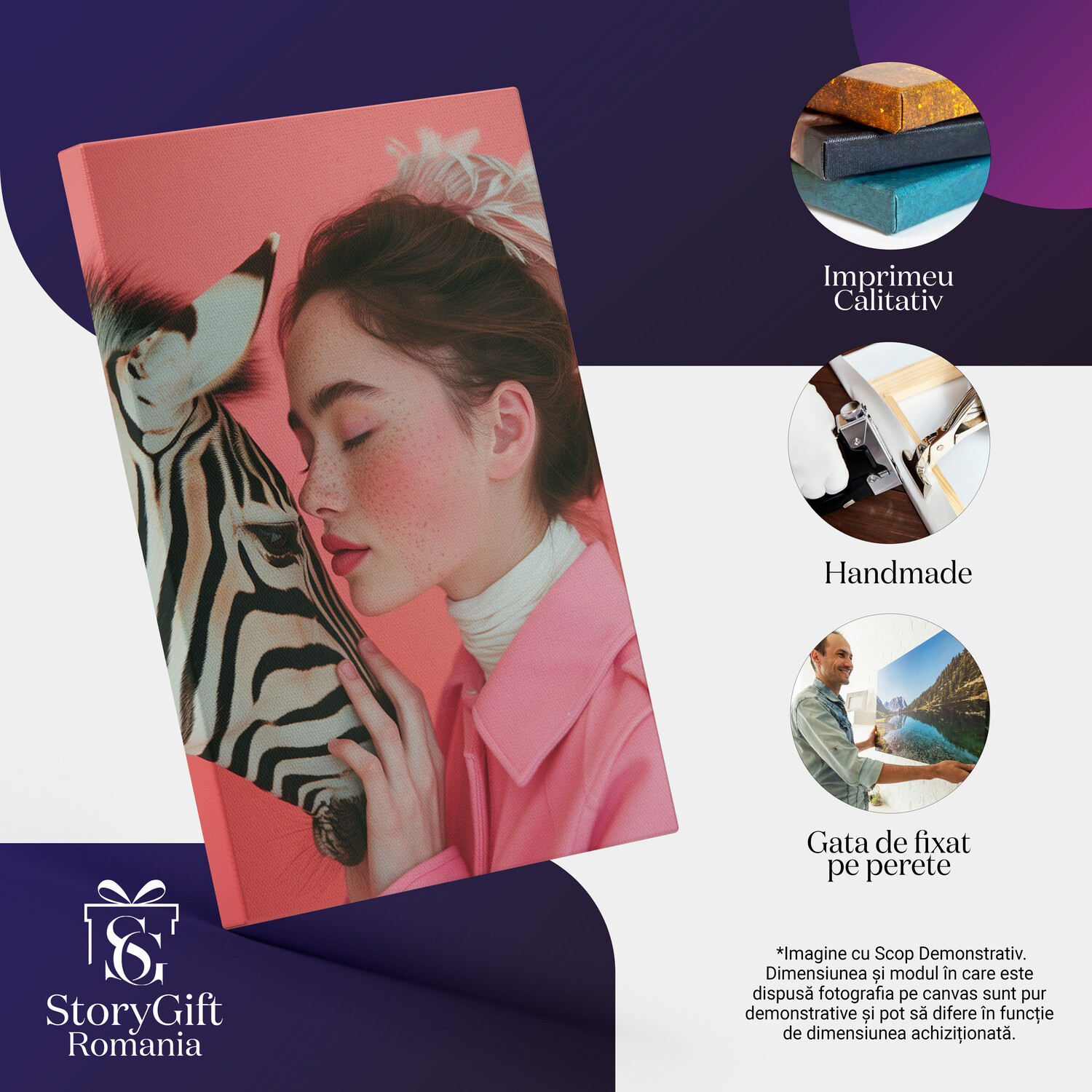 Tablou Canvas: Fotografie Artistica pe Fundal Roz si Contraste Vestimentare, Alaturi de Zebra- Animale Salbatice Pictura Digitala - Tablou Canvas Signature de la StoryGift Romania