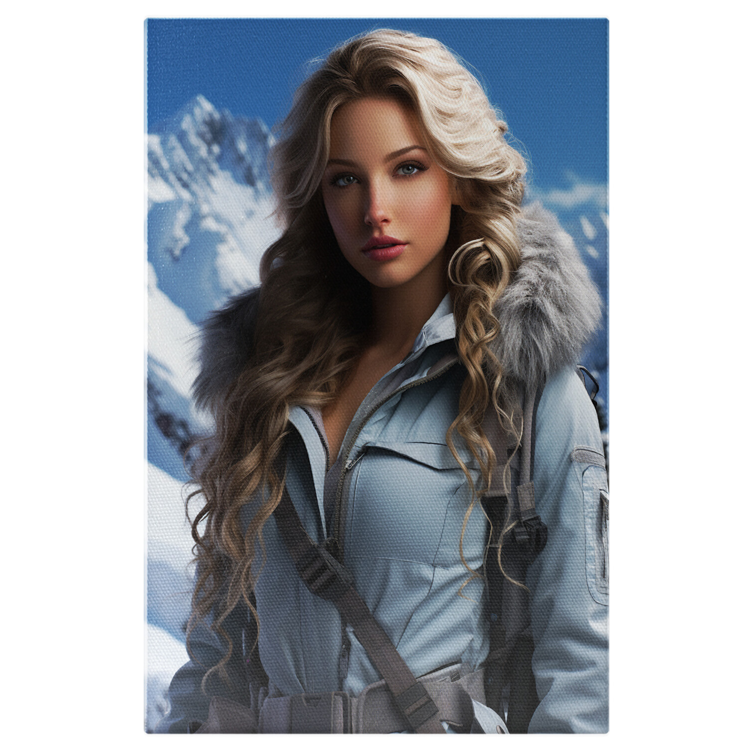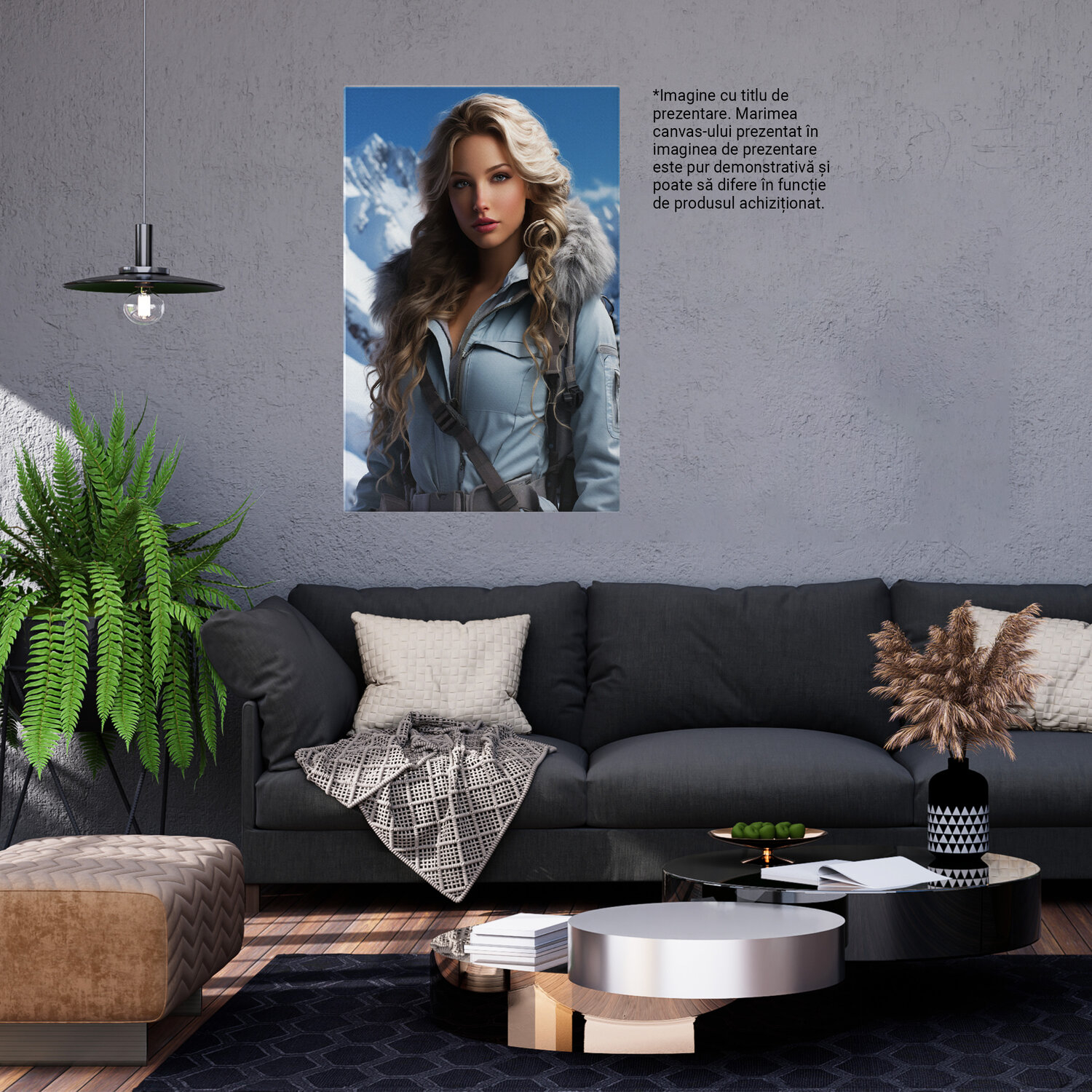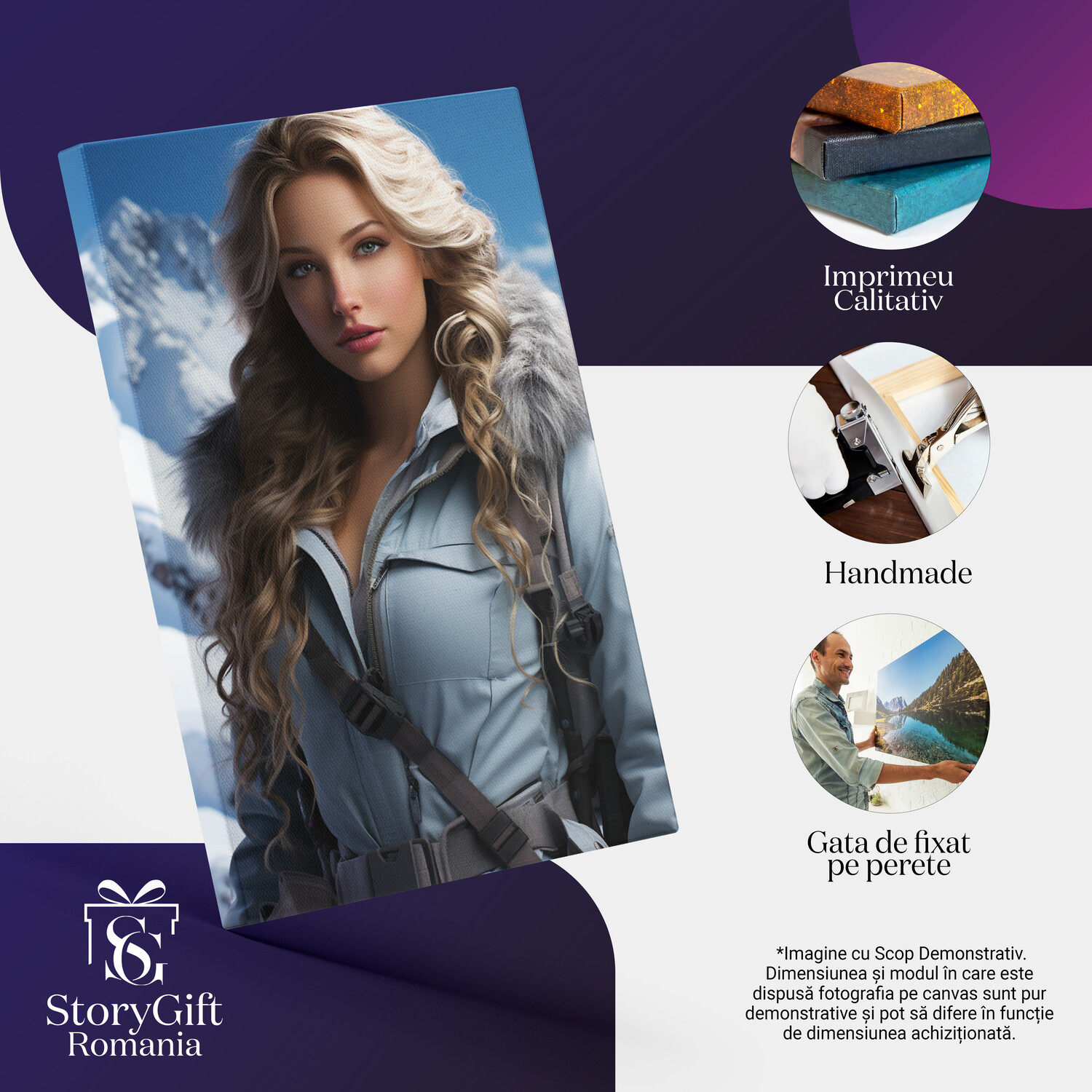 Tablou Canvas: Fulgii Iernii in Peisajul Alb din Munti Exploratoarea Blonda Feminitate si Perfectiune Pictura Digitala - Tablou Canvas Signature de la StoryGift Romania