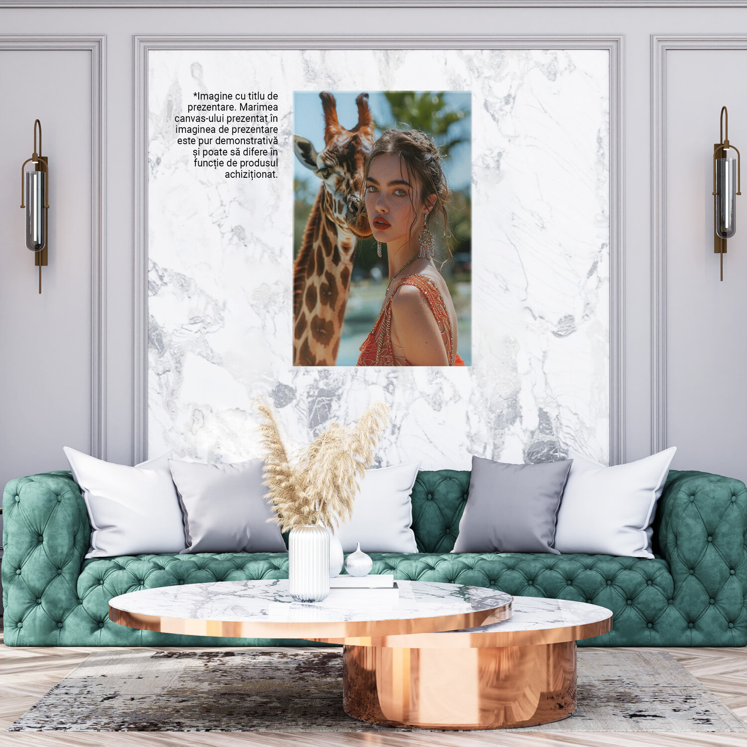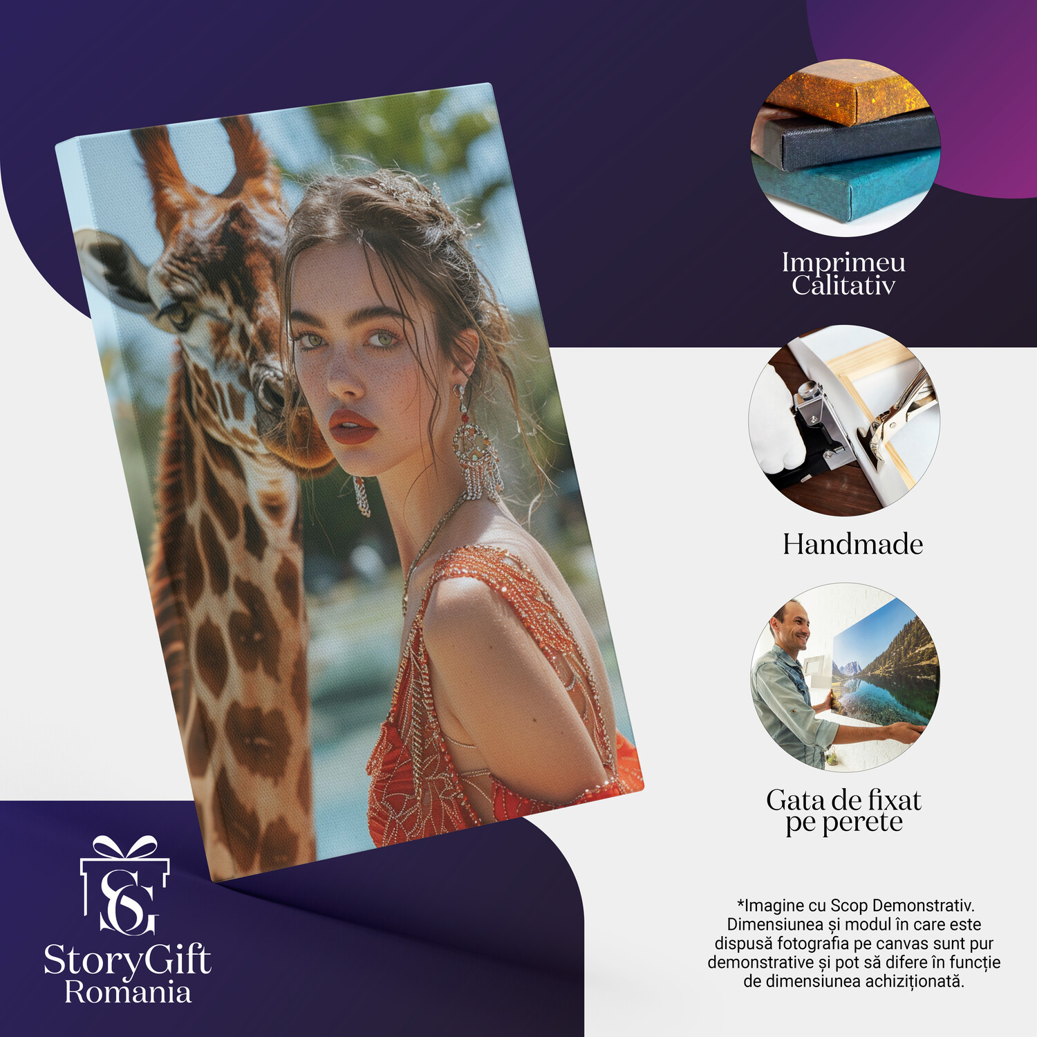 Tablou Canvas Girafa care Priveste catre o Fata cu Ochii Verzi si Cercei Lungi in Rochie Rosie cu Bretele si Pistrui , Pictura Digitala - Tablou Canvas Signature de la StoryGift Romania