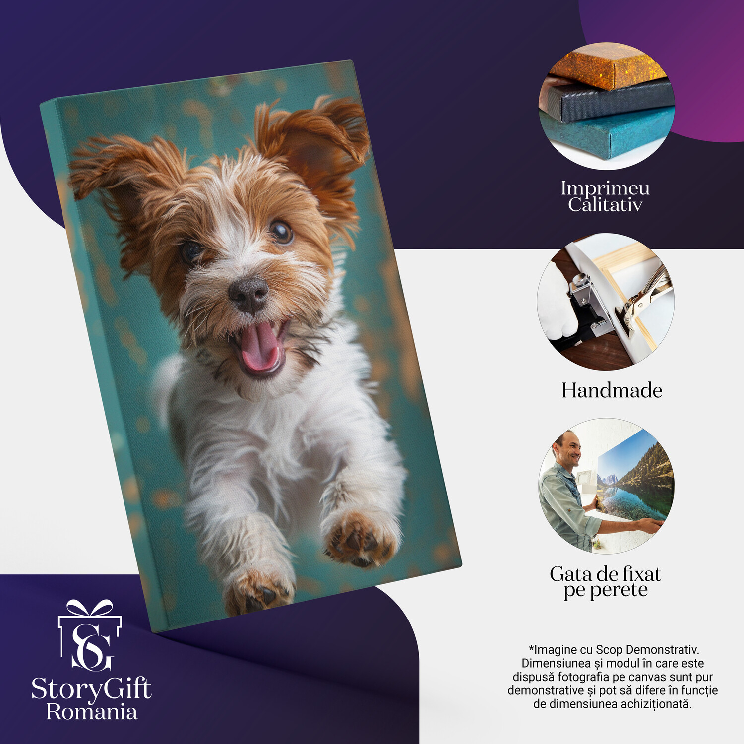 Tablou Canvas Happy Puppy cu Ochii Caprui si Nasul Mic cu Blana Alba-Maronie Sarind in Sus de Bucurie , Pictura Digitala - Tablou Canvas Signature de la StoryGift Romania