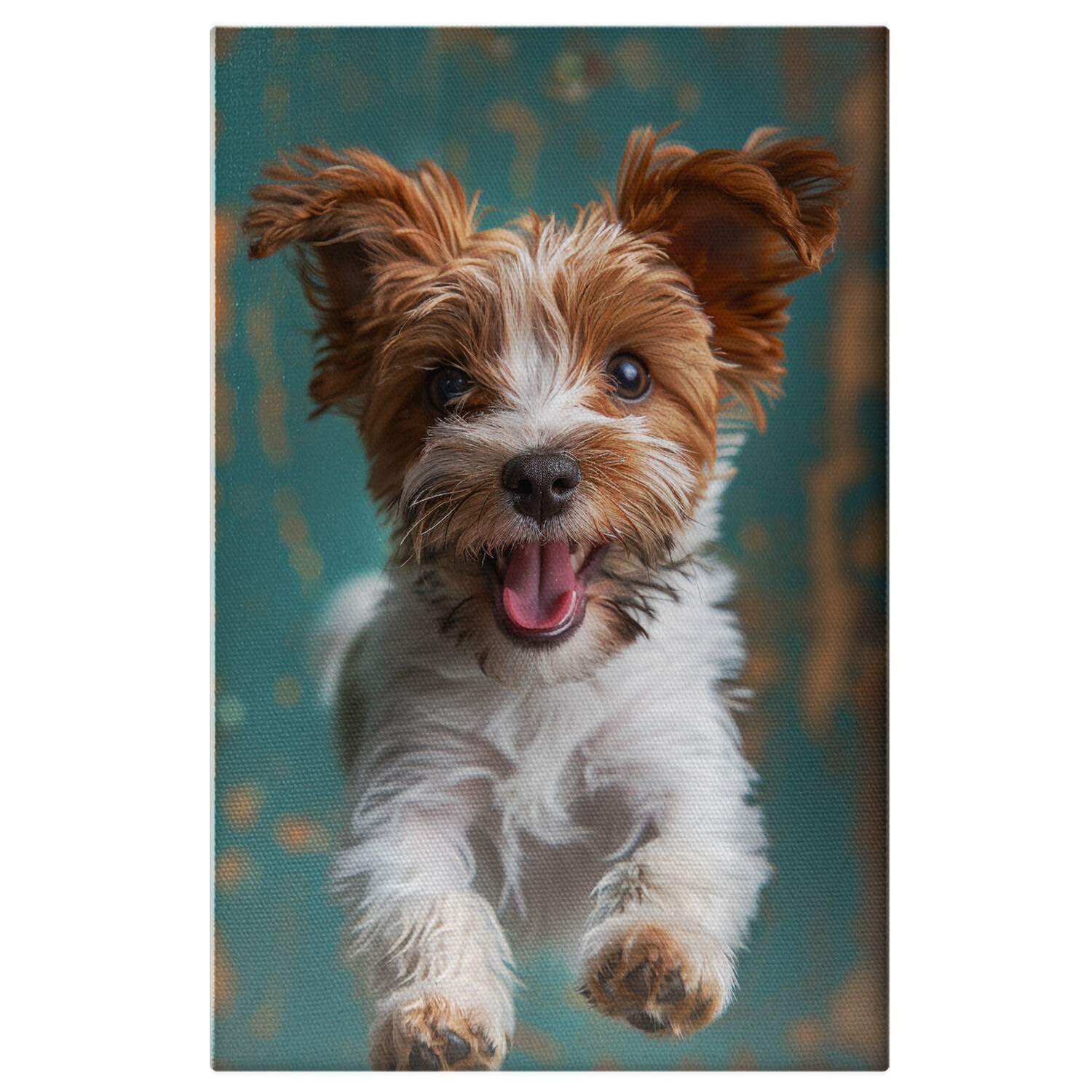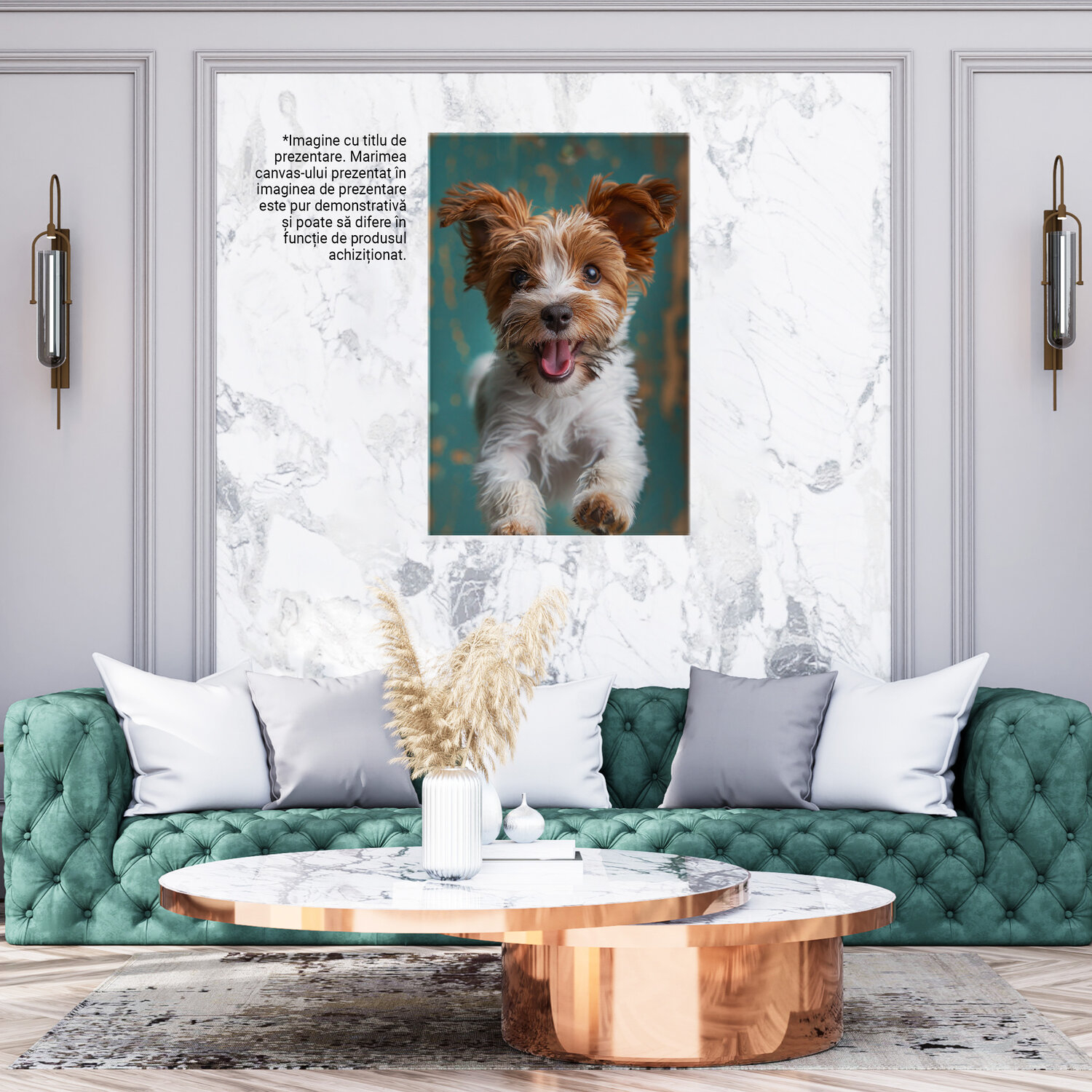 Tablou Canvas Happy Puppy cu Ochii Caprui si Nasul Mic cu Blana Alba-Maronie Sarind in Sus de Bucurie , Pictura Digitala 60x40CM