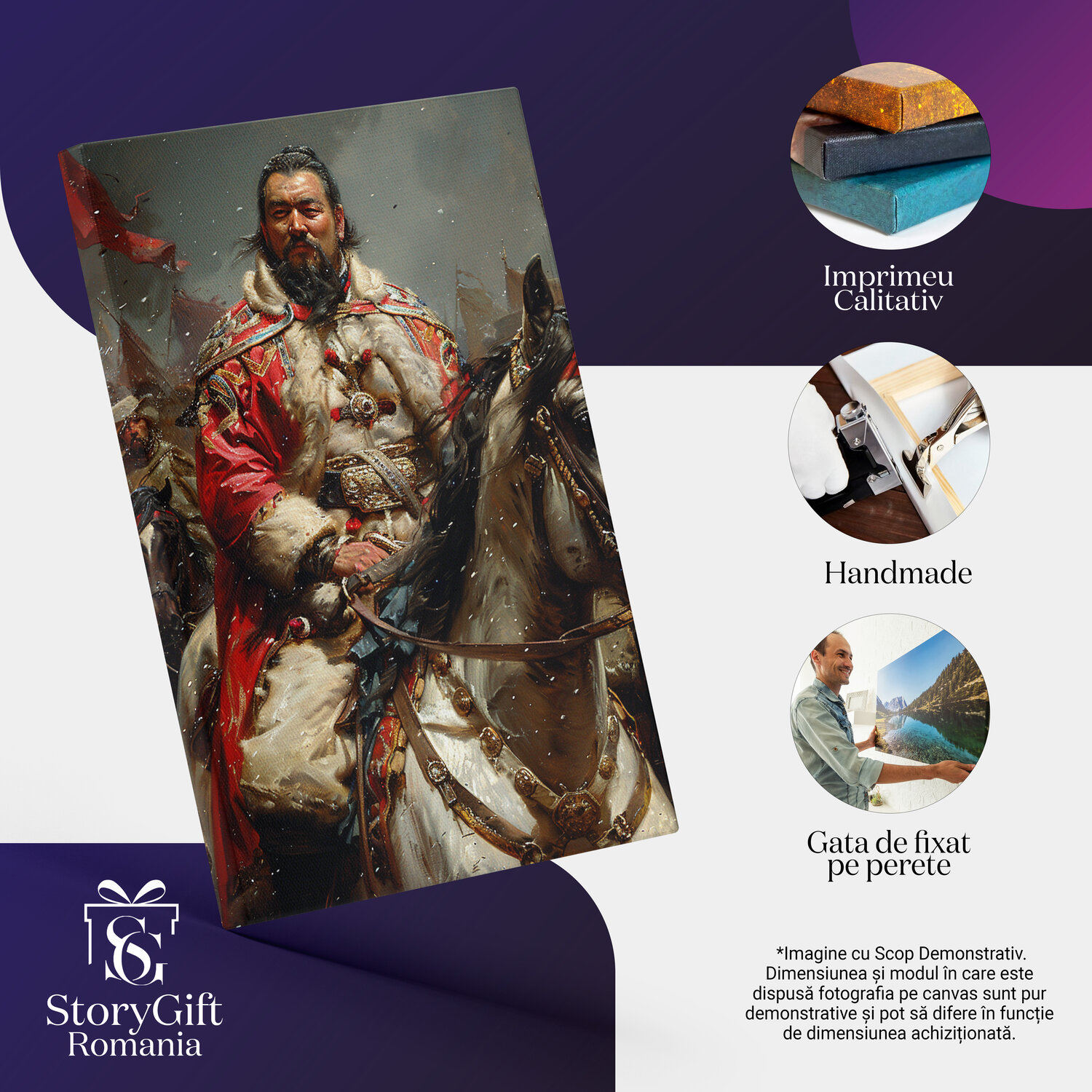 Tablou Canvas Japonez in Costum Rosu cu Pelerina pe un Cal Alb cu Coama Neagra care Merge la Lupta , Pictura Digitala - Tablou Canvas Signature de la StoryGift Romania