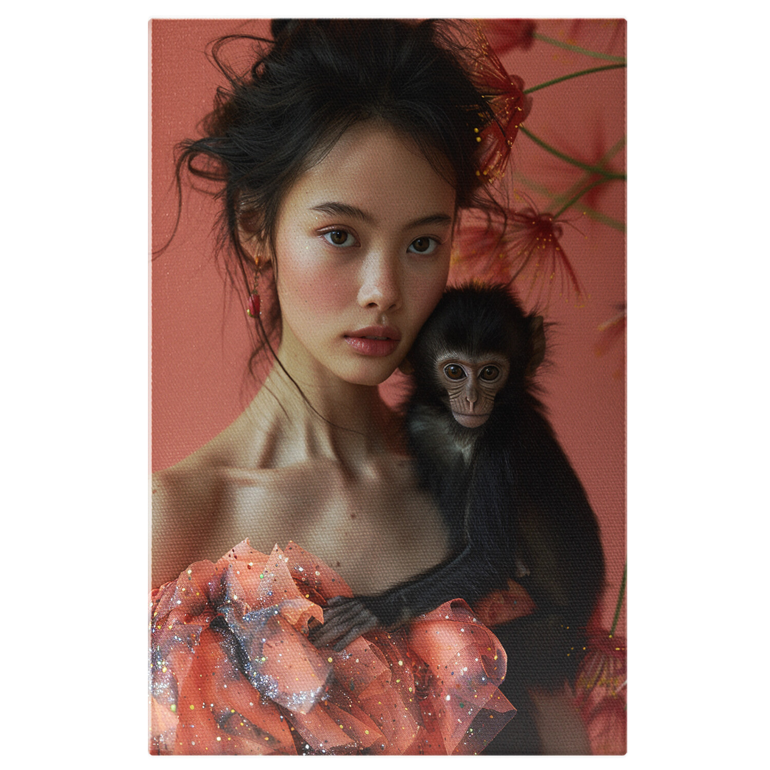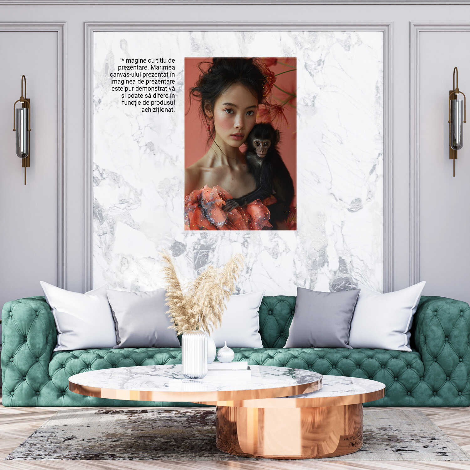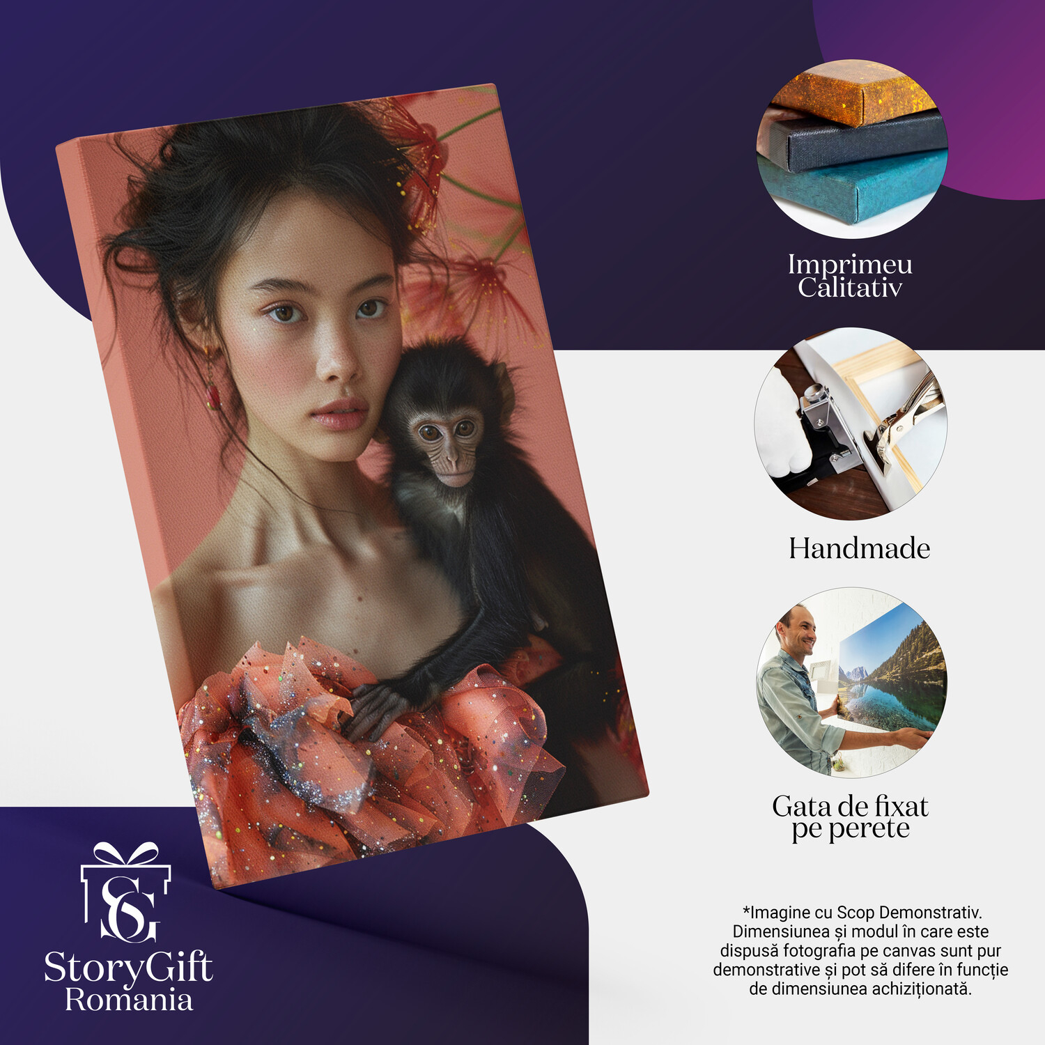 Tablou Canvas Japoneza cu Cercei si Ochii Mari cu Parul Brunet in Rochie de care sta Agatata o Maimutica , Pictura Digitala - Tablou Canvas Signature de la StoryGift Romania
