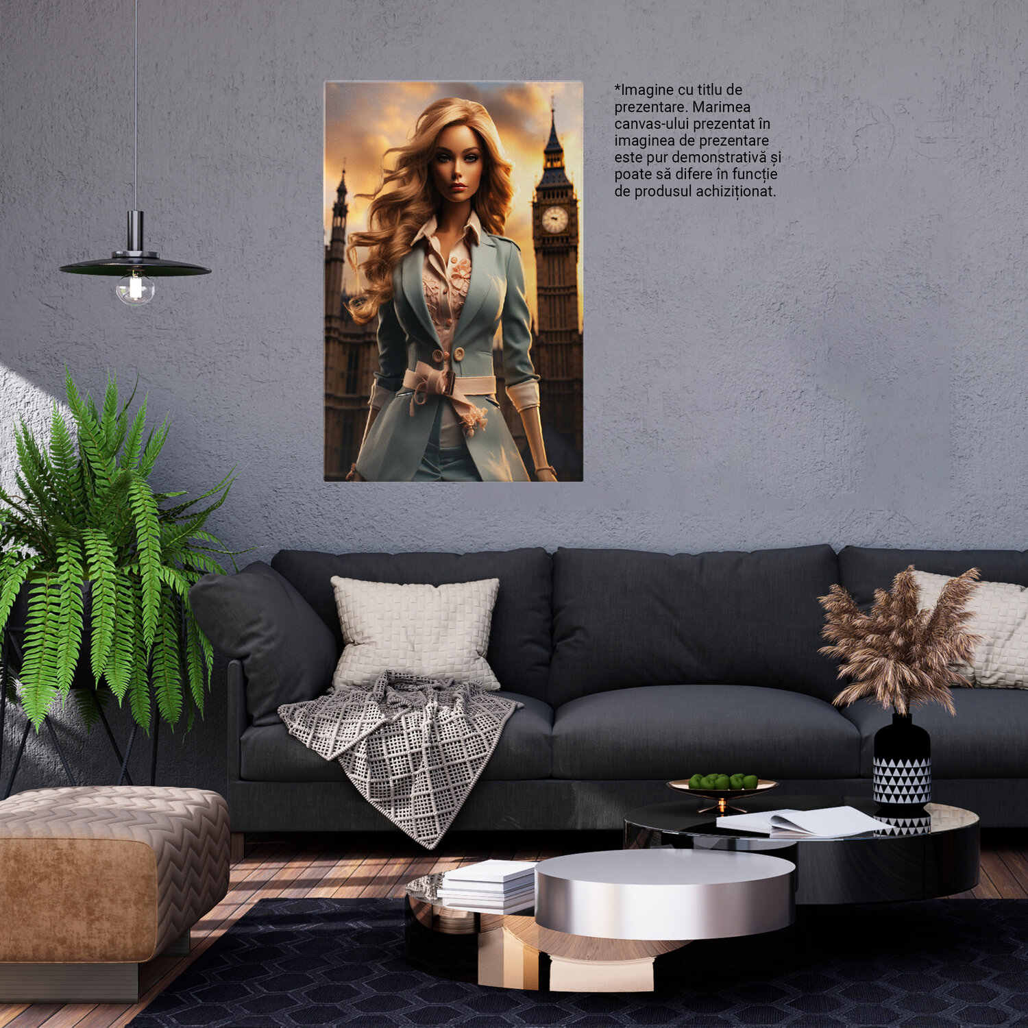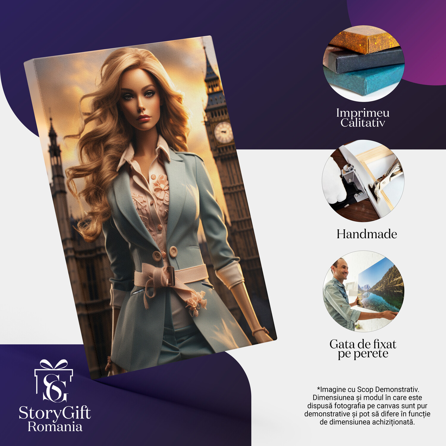 Tablou Canvas: Lady near Big Ben, Fata in Costum Albastru ca Marea si Camasa Alba cu Bratara si Inel Pictura Digitala - Tablou Canvas Signature de la StoryGift Romania