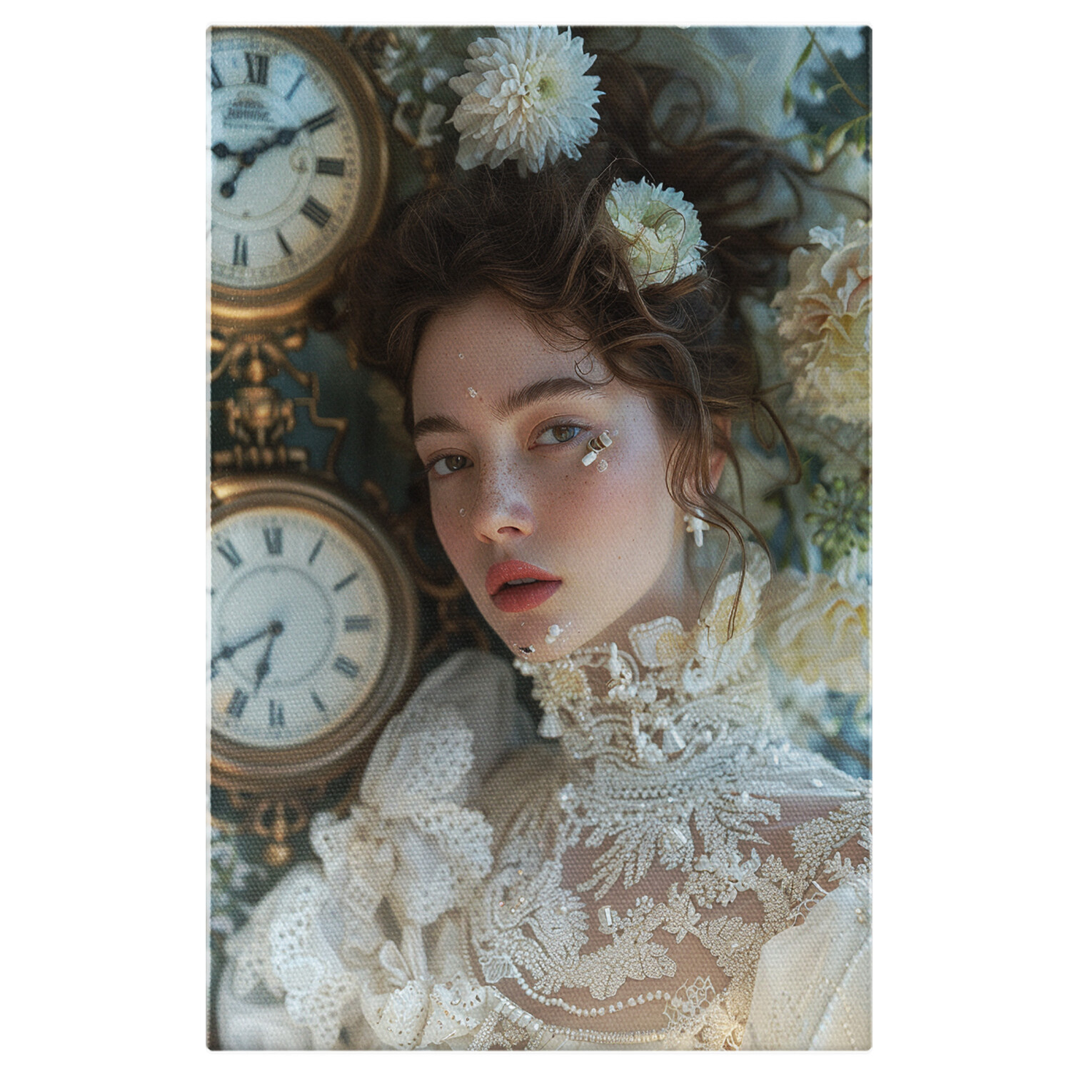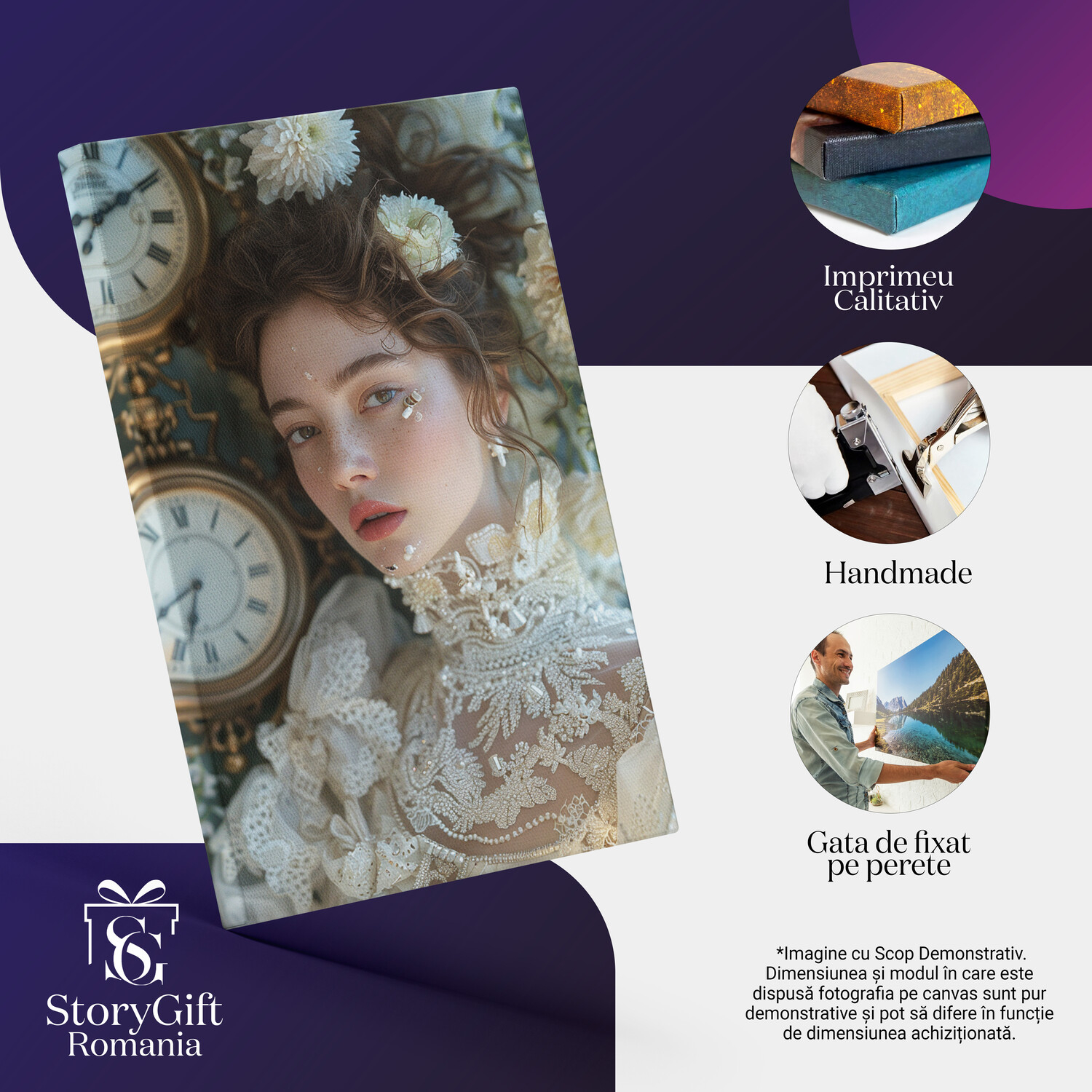 Tablou Canvas Minunata Tanara cu Parul Saten si Ochii Blanzi cu Pistrui langa un Perete cu Ceasuri in Rochie , Pictura Digitala - Tablou Canvas Signature de la StoryGift Romania