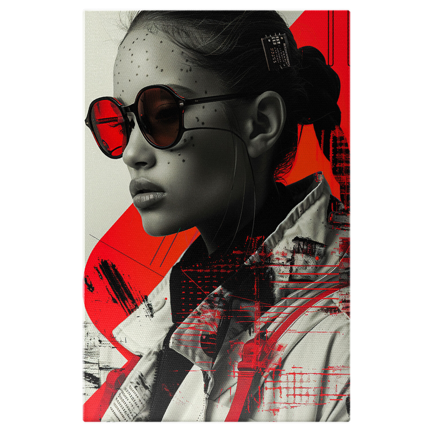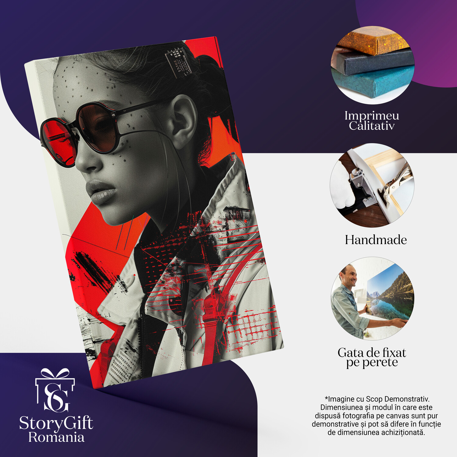 Tablou Canvas Misterious Woman cu Ochelari si Pete pe fata cu Parul Prins in Geaca Alba cu Buze Mari , Pictura Digitala - Tablou Canvas Signature de la StoryGift Romania