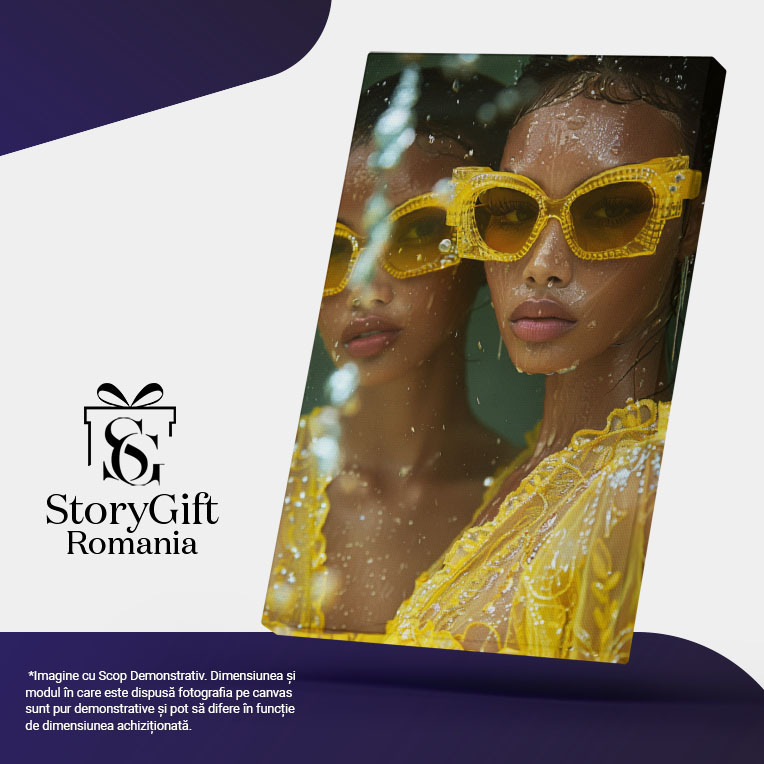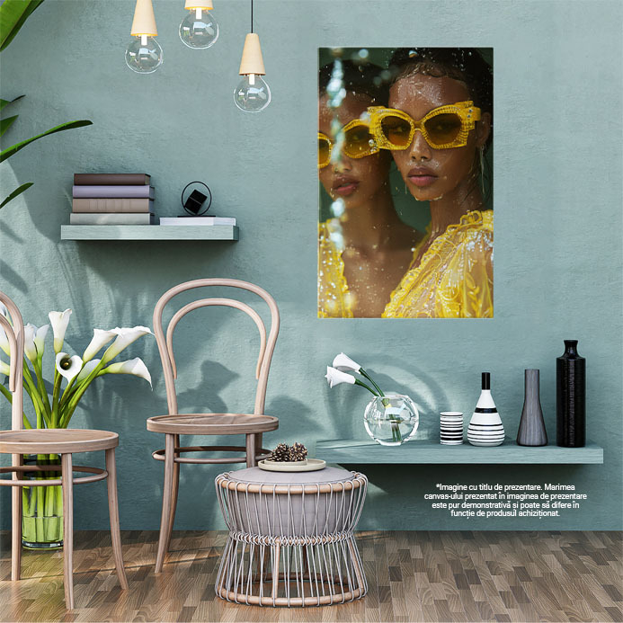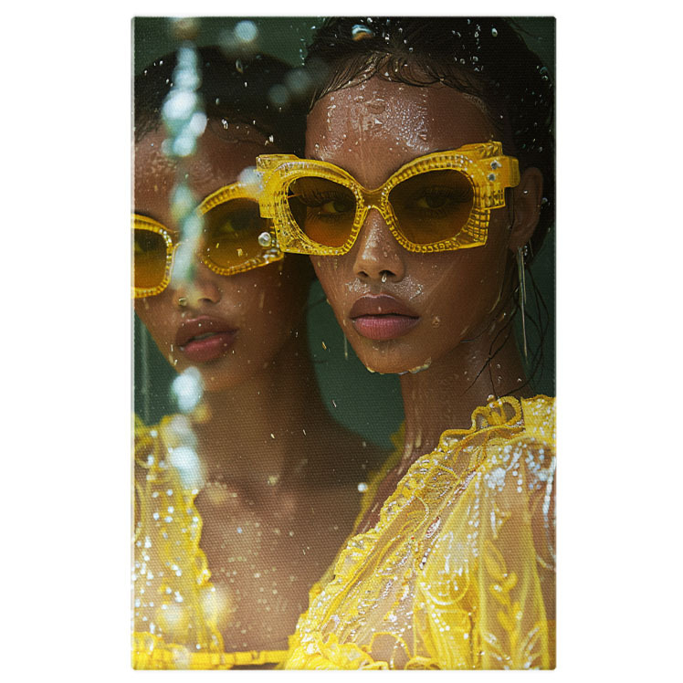 Tablou Canvas Mulatra cu Ochelari Asortati cu Rochia Galbena si Cercei Lungi cu Buze Mari si Gene Lungi , Pictura Digitala 40x25CM