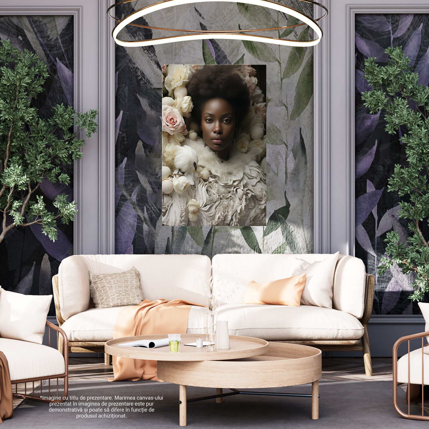 Tablou Canvas: O femeie de culoare imbracata in alb - eleganta pasare flori Pictura Digitala - Tablou Canvas Signature de la StoryGift Romania