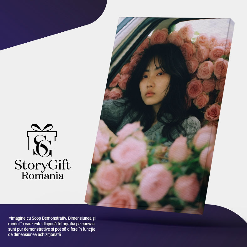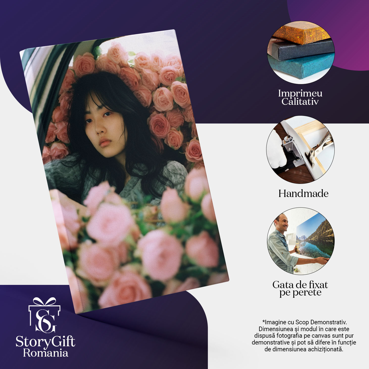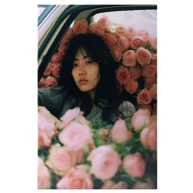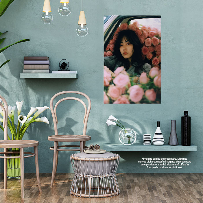 Tablou Canvas: Portret de fata in masina - plina cu trandafiri fotografie roz Pictura Digitala 40x25CM
