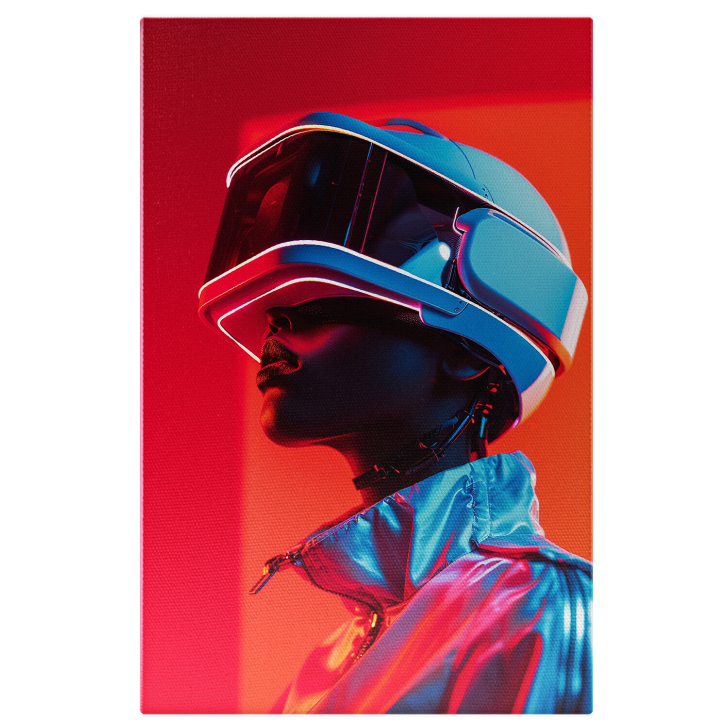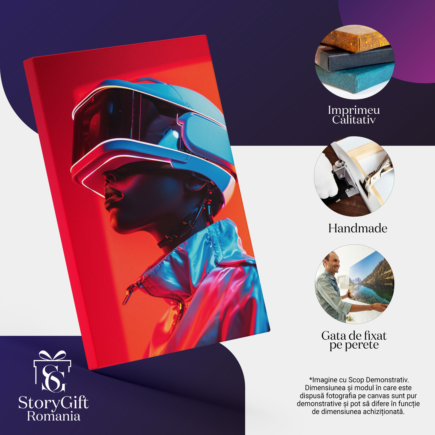 Tablou Canvas OchelarI si casca VR experimentati de model - Geaca lucioasa in LED rosu , Pictura Digitala - Tablou Canvas Signature de la StoryGift Romania