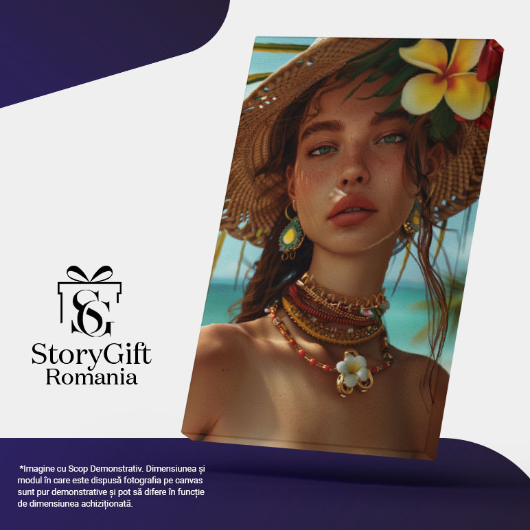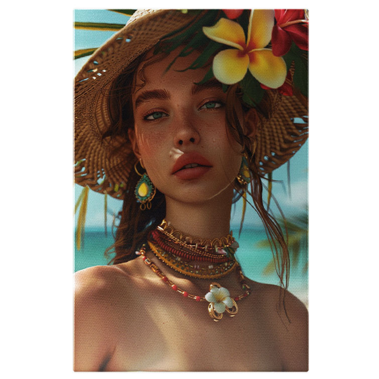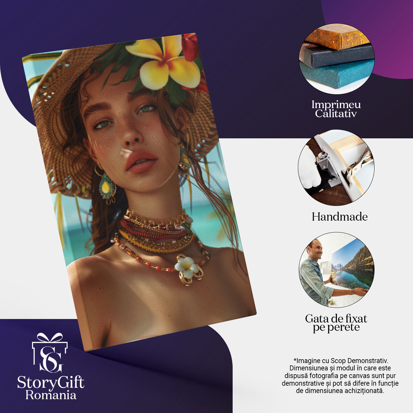 Tablou Canvas Ochii Verzi Pierduți în Zare ai Tinerei cu Pălărie de Paie pe Insula Însorită , Pictura Digitala 40x25CM