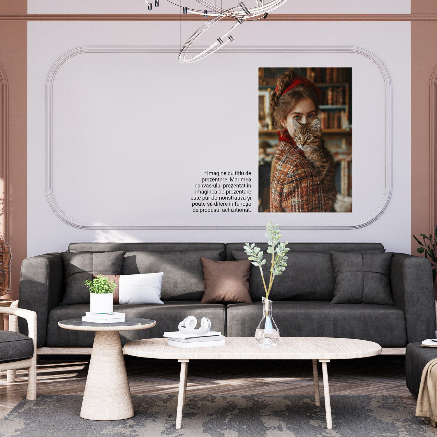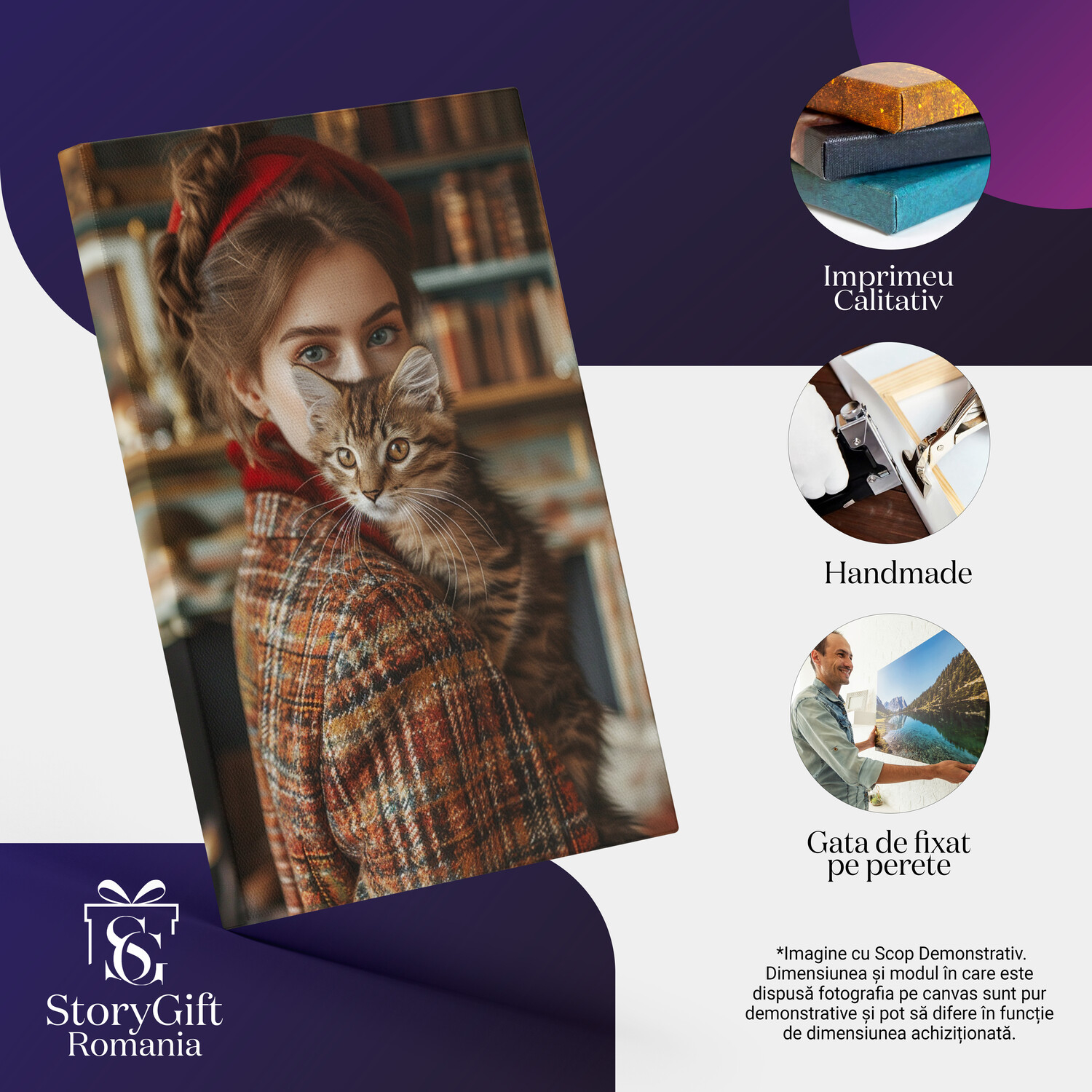 Tablou Canvas: Ochii Verzi si Ochii Albastri Doamna si Pisoiul din Biblioteca cu Bentita Rosie Pictura Digitala - Tablou Canvas Signature de la StoryGift Romania