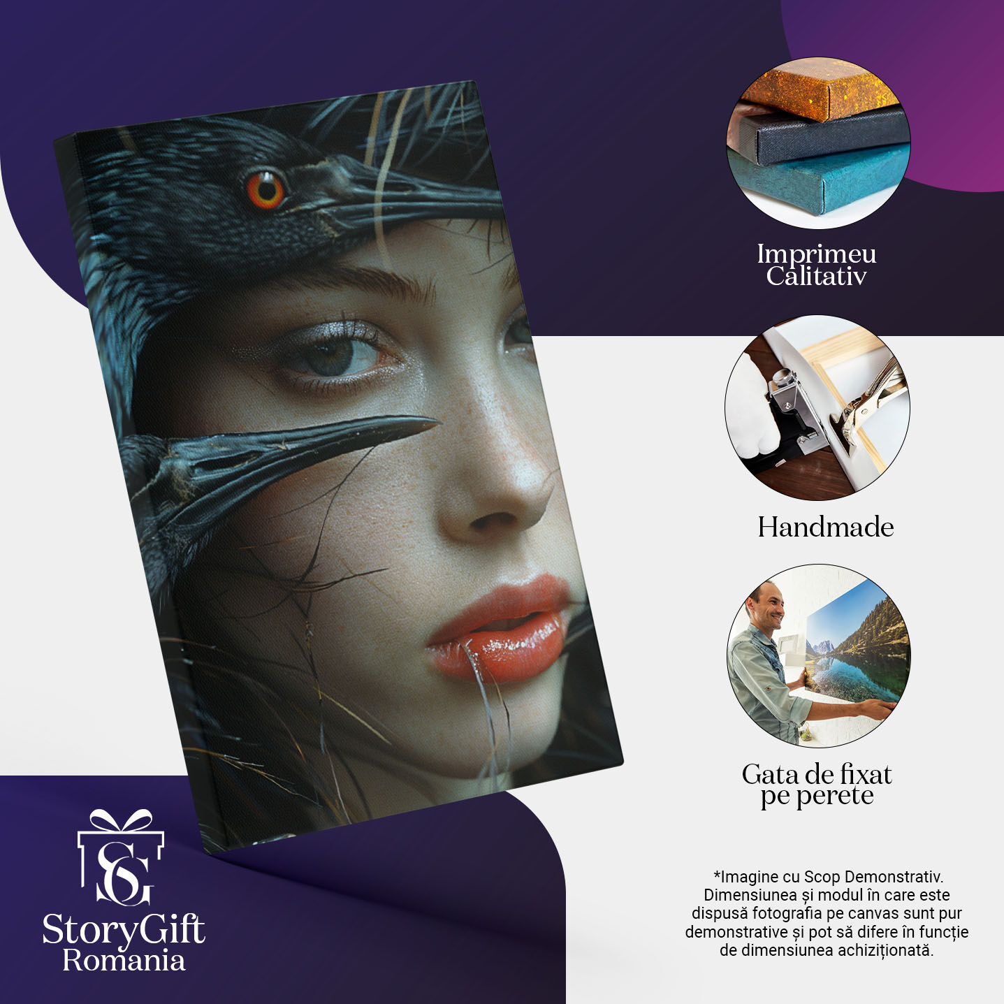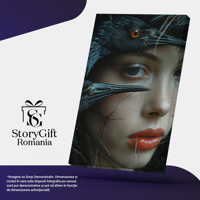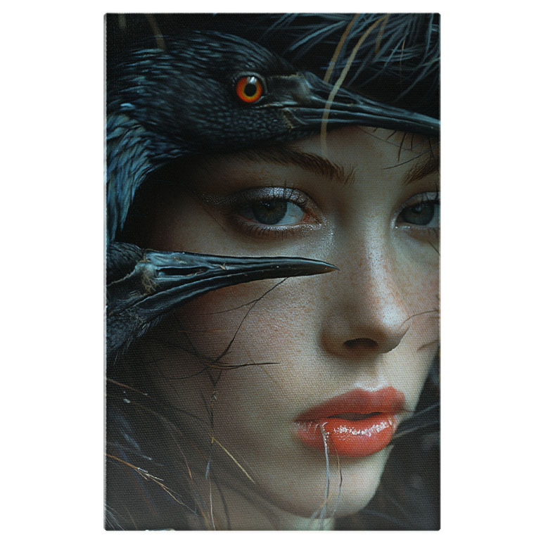 Tablou Canvas Păsările Negre cu Ochi de Foc și Chipul Fetei cu Ochi Albăstrui Misterioși , Pictura Digitala 40x25CM