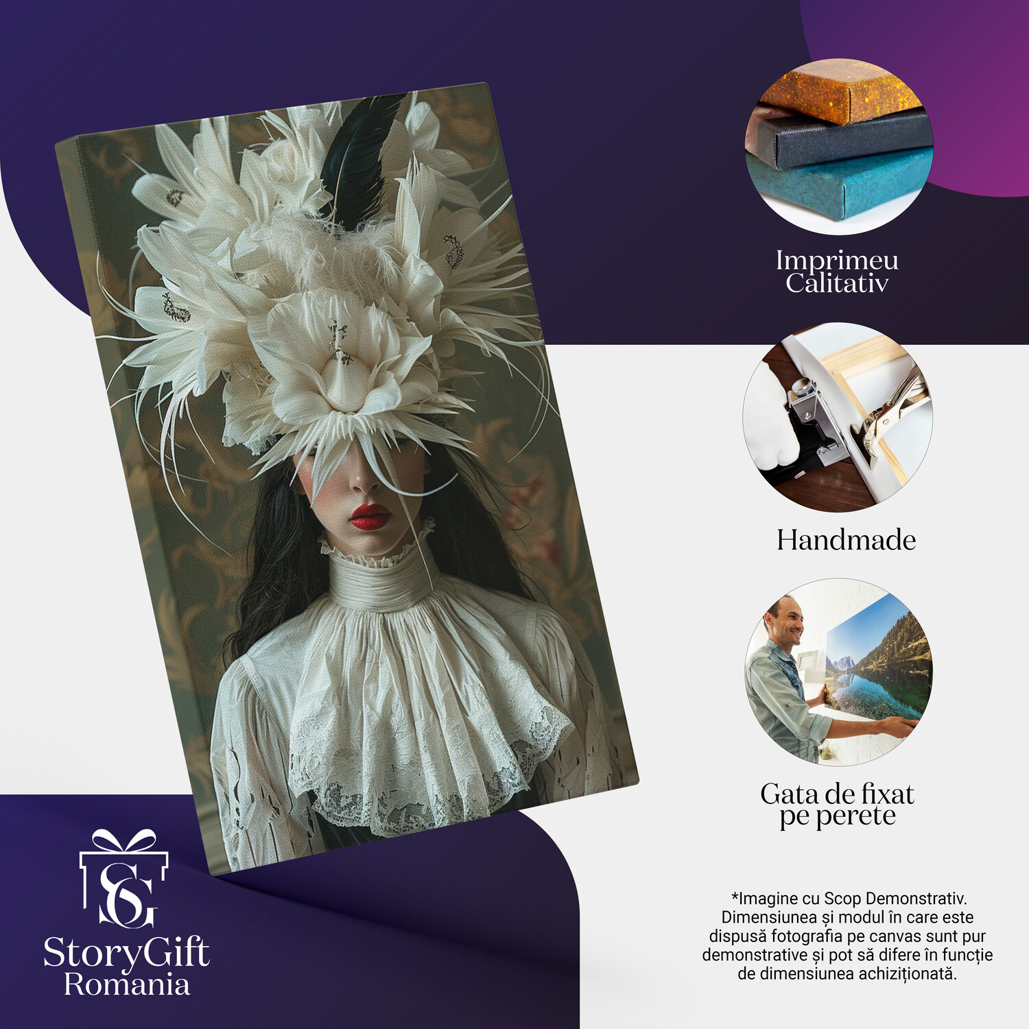 Tablou Canvas Palarie Alba cu Model de Flori si Pana Negra care Acopera Chipul unei Femei cu Ruj Rosu , Pictura Digitala - Tablou Canvas Signature de la StoryGift Romania