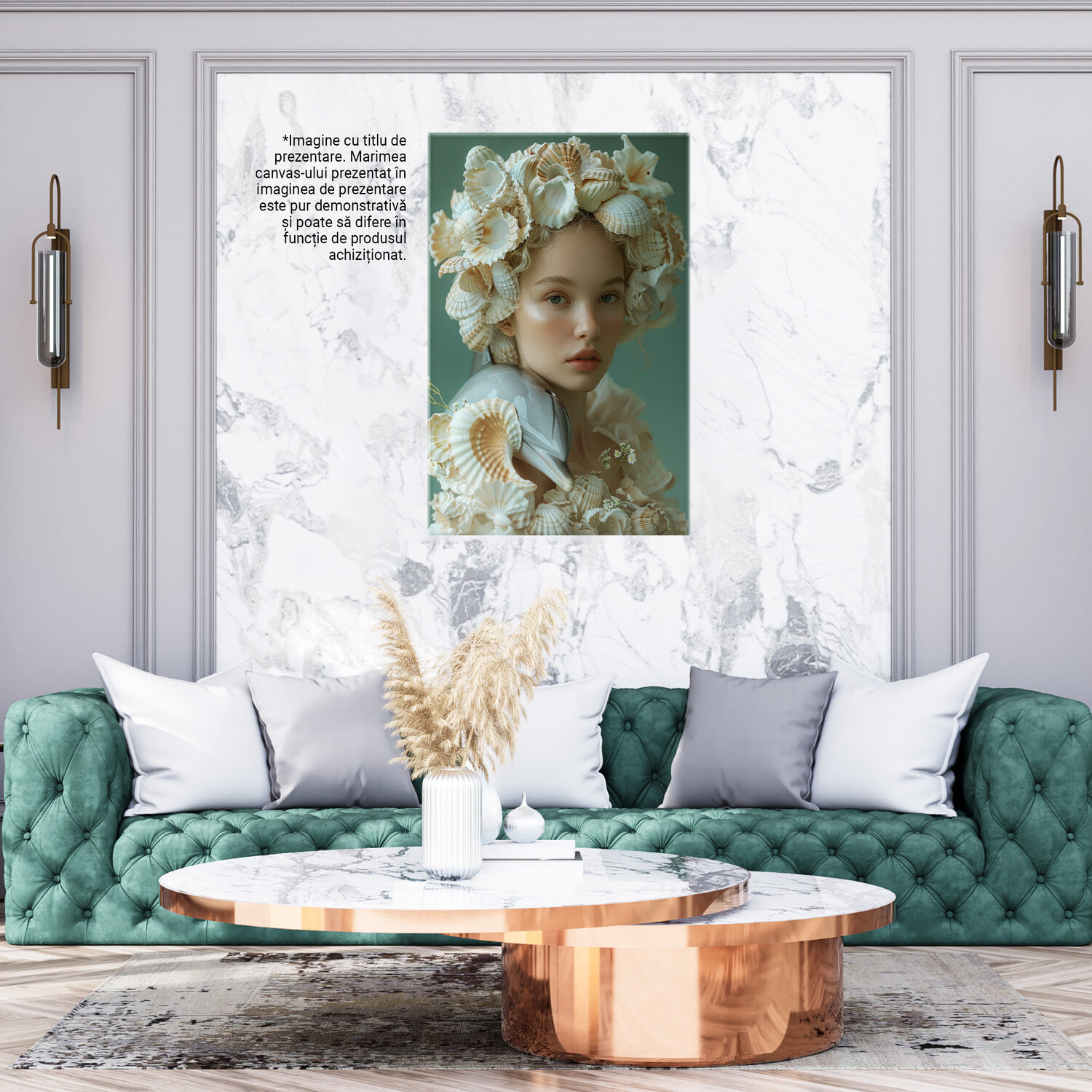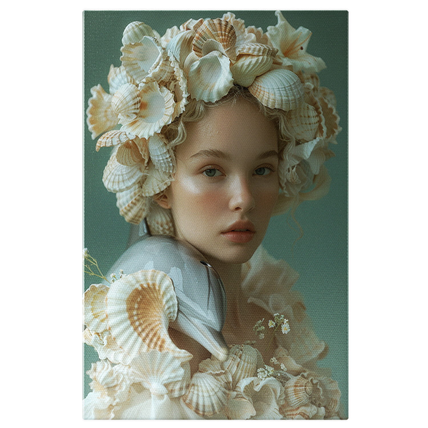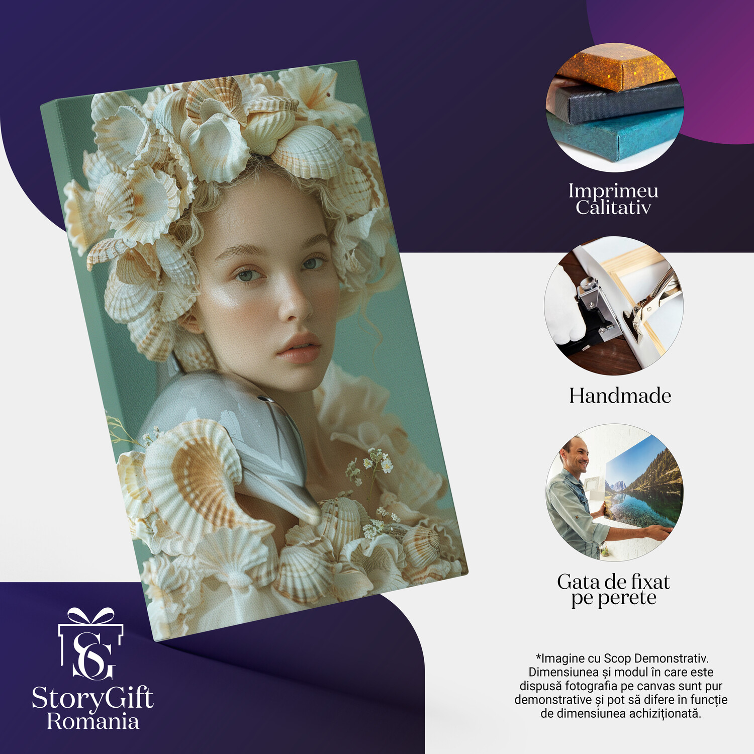 Tablou Canvas Persoana Feminina cu Chipul Senin si Palarie si Rochie facute din Scoici cu o Figurina Delfin pe Umar , Pictura Digitala - Tablou Canvas Signature de la StoryGift Romania