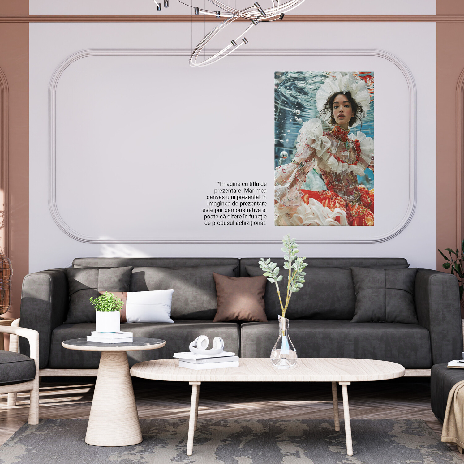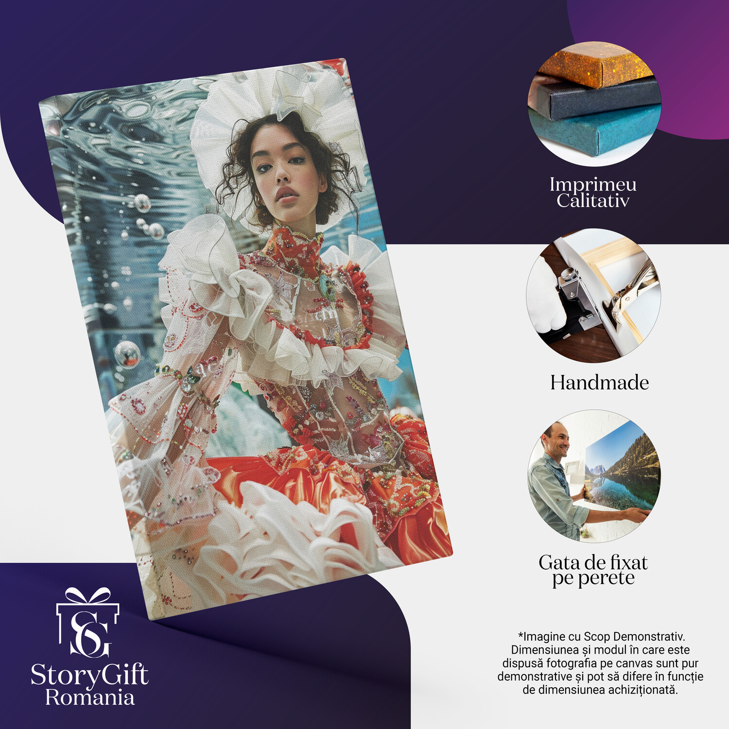 Tablou Canvas: Portret Femie Subacvatic cu Rochie Rosie si Volane- Fotografie Artistica Pictura Digitala - Tablou Canvas Signature de la StoryGift Romania