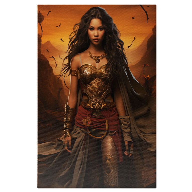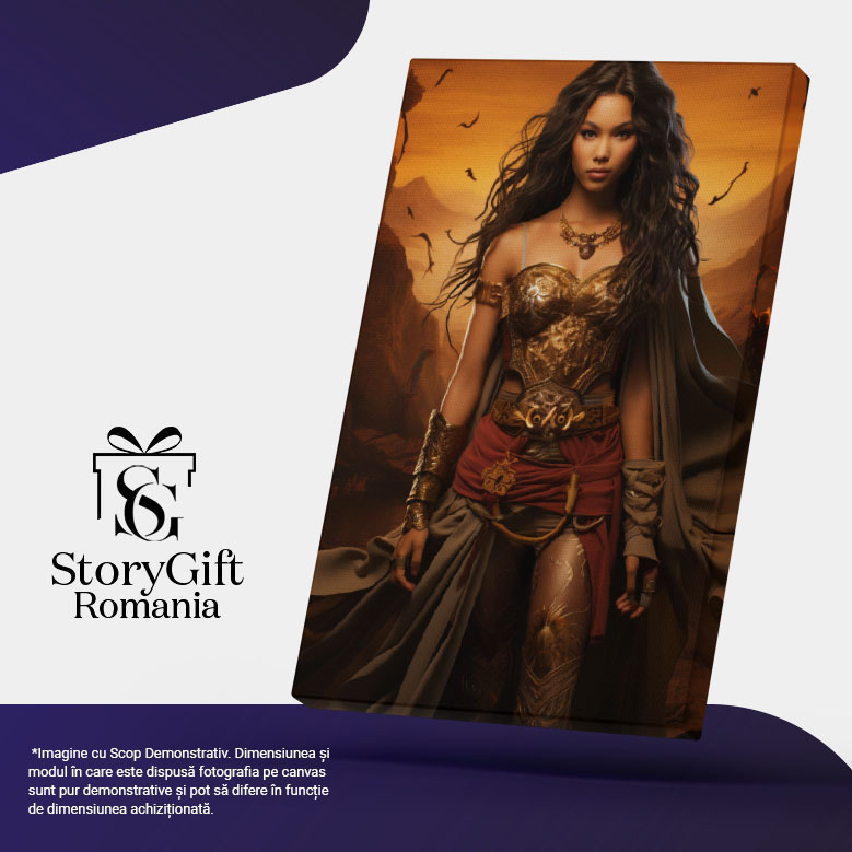 Tablou Canvas: Printesa razboinica in armura aflata in pustietate si pregatita de lupta-portret feminin fantastic Pictura Digitala 40x25CM