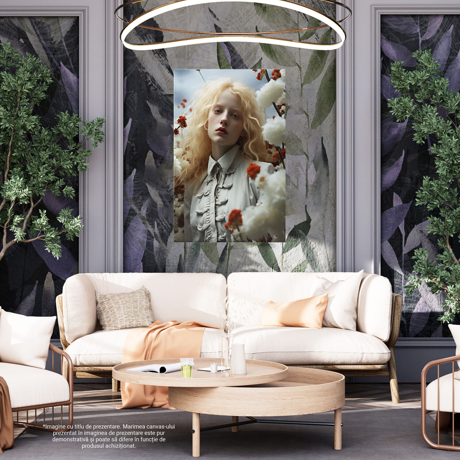 Tablou Canvas: Portret Feminin European Albinism intre Flori Albe si Rosii Pictura Digitala 40x25CM