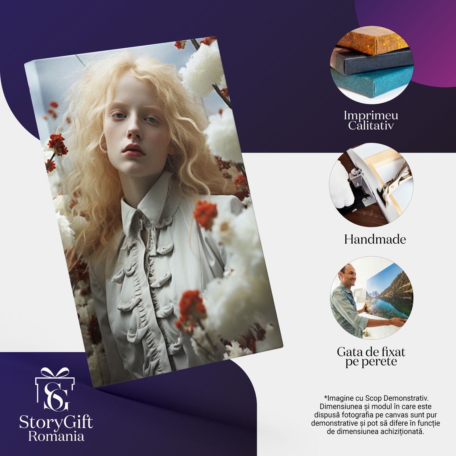 Tablou Canvas: Portret Feminin European Albinism intre Flori Albe si Rosii Pictura Digitala - Tablou Canvas Signature de la StoryGift Romania