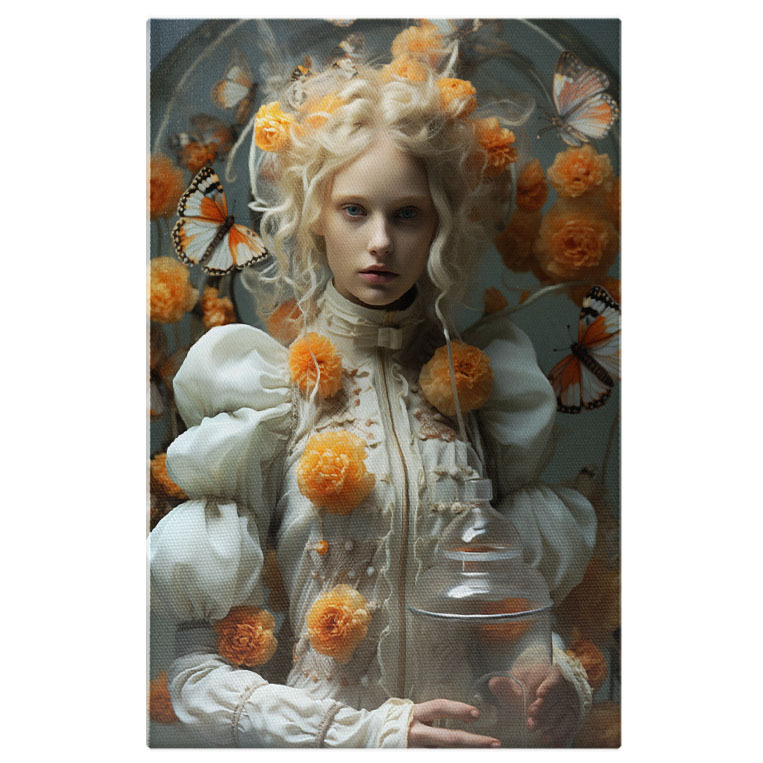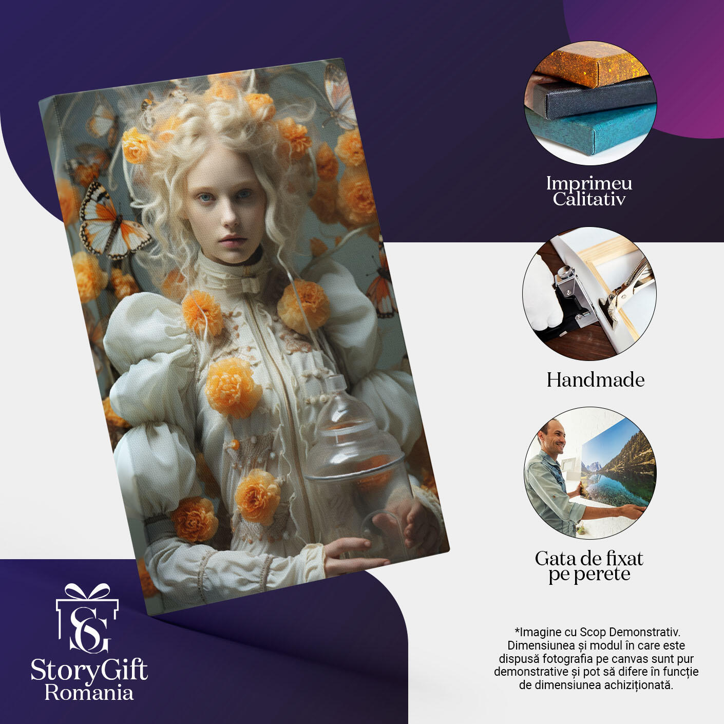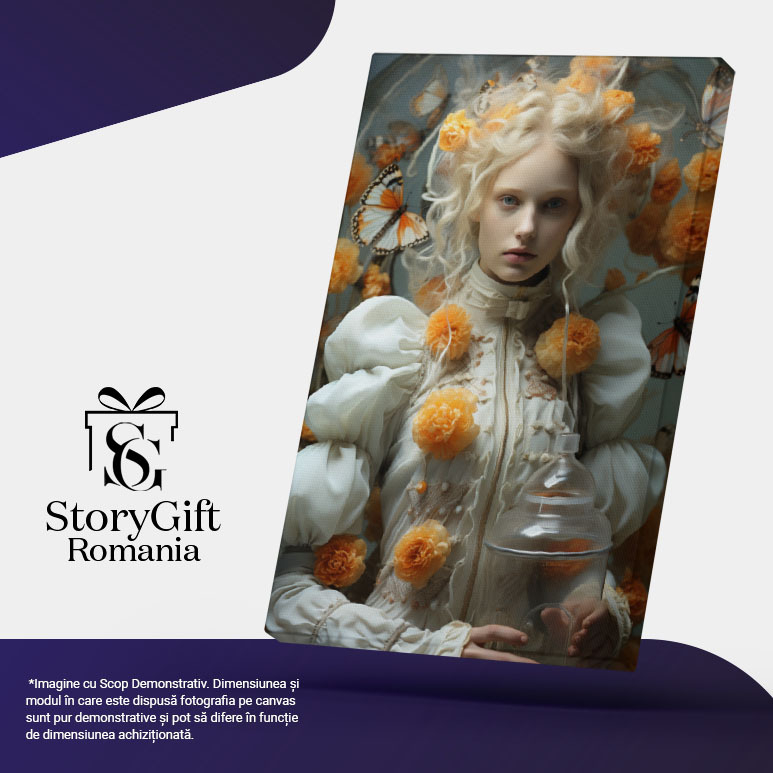 Tablou Canvas: Fotografie cu o fata blonda care tine un vas din sticla - flori fluturi Pictura Digitala 40x25CM