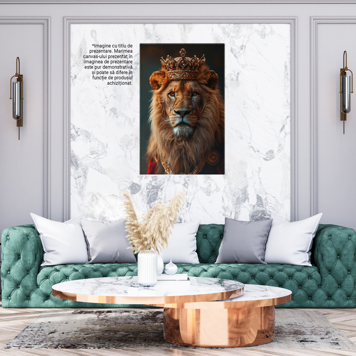 Tablou Canvas Regele Savanei Leul Veghind Peste Teritoriul Sau Intins in Mantou Regal si Coroana , Pictura Digitala 40x25CM