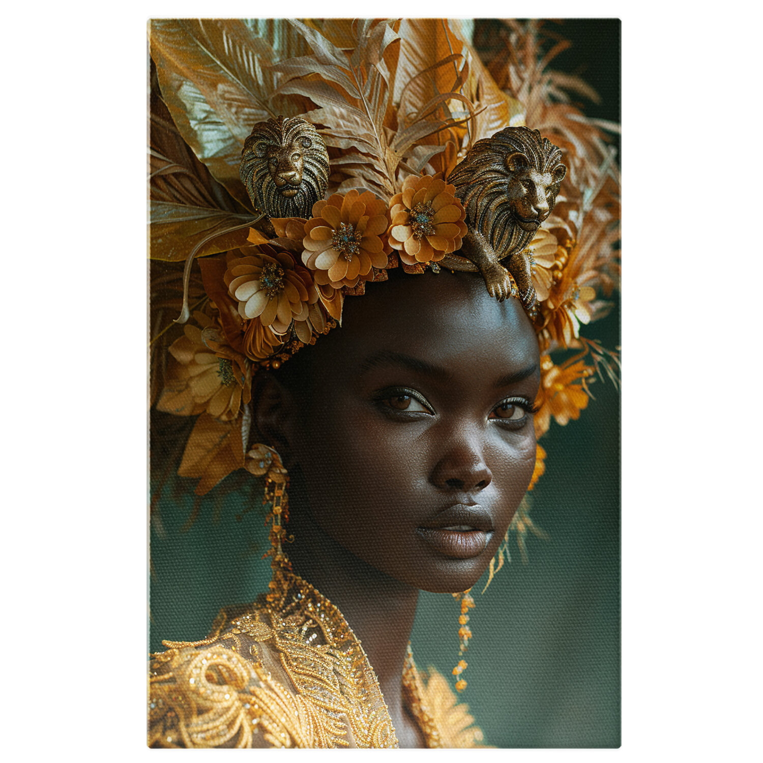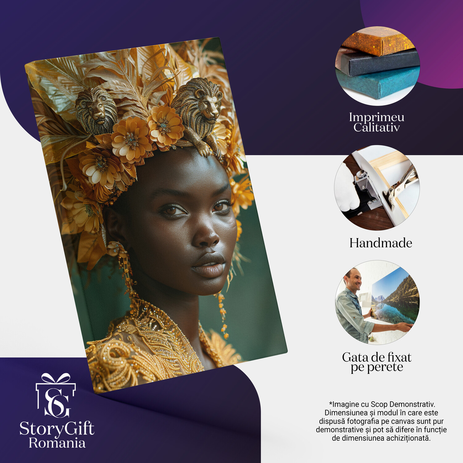 Tablou Canvas Regina Incoronata cu Figurine de Lei in Cap din Africa cu Palarie din Pene si Floricele cu Cercei , Pictura Digitala - Tablou Canvas Signature de la StoryGift Romania