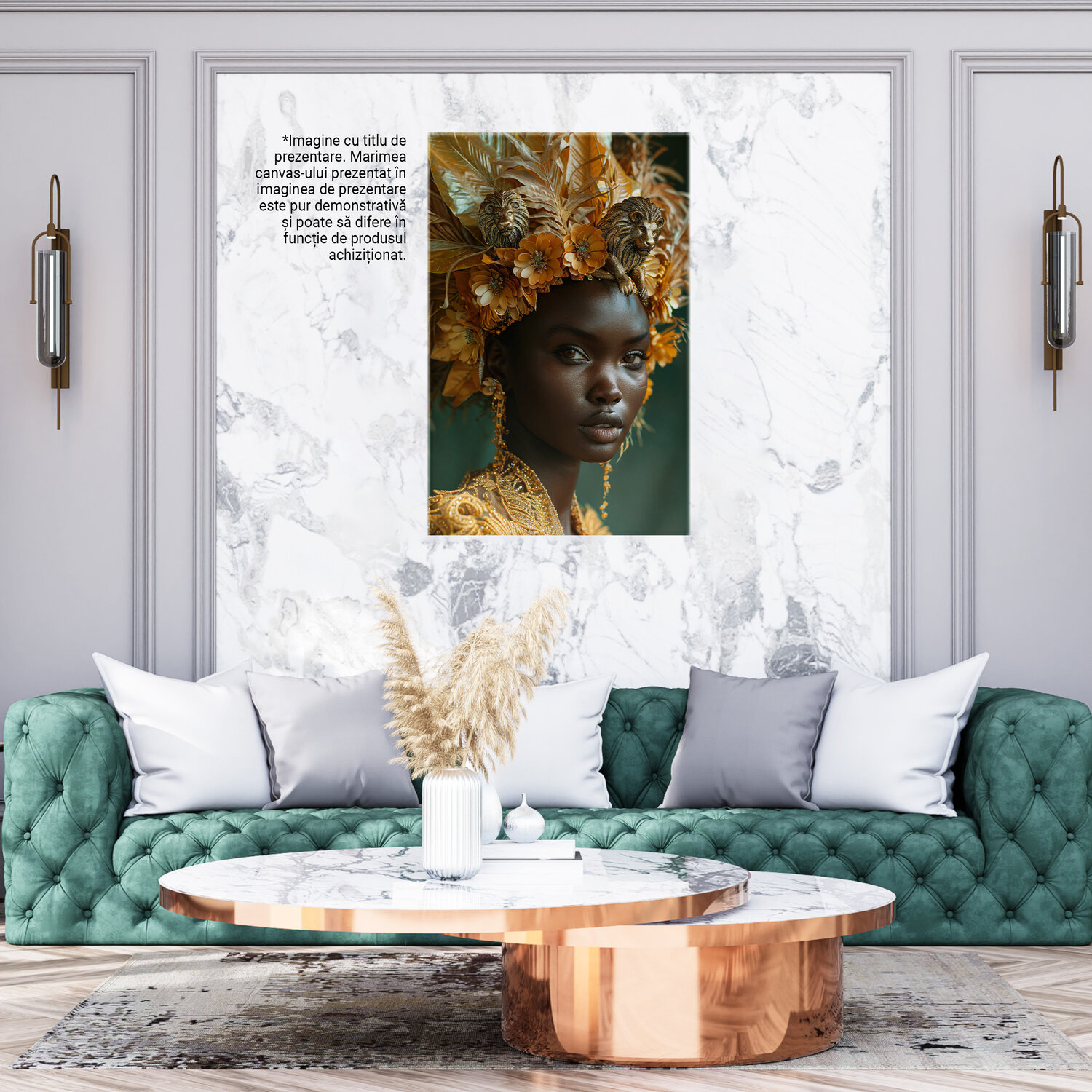 Tablou Canvas Regina Incoronata cu Figurine de Lei in Cap din Africa cu Palarie din Pene si Floricele cu Cercei , Pictura Digitala 40x25CM