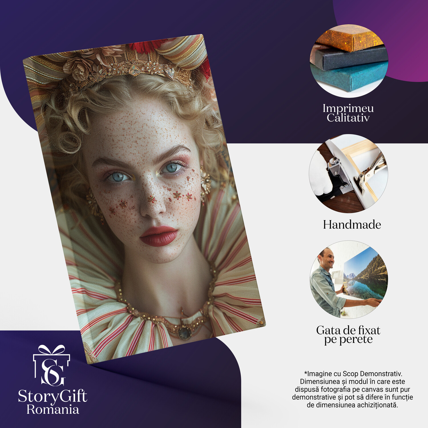 Tablou Canvas Seductive Lady cu Pistrui si Stelute pe Fata cu Par Blond si Palarie in Rochie cu Guler si Cercei , Pictura Digitala - Tablou Canvas Signature de la StoryGift Romania