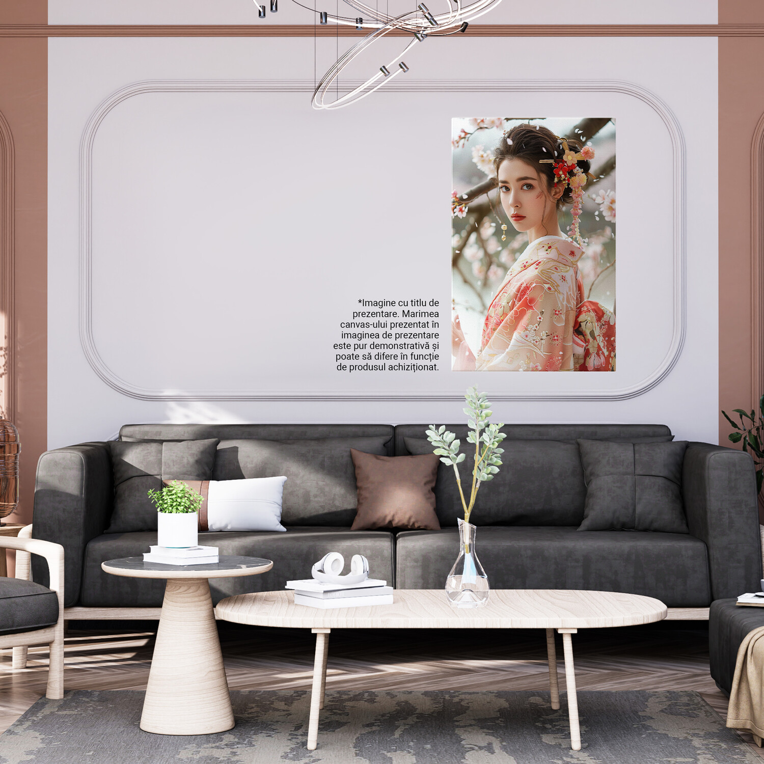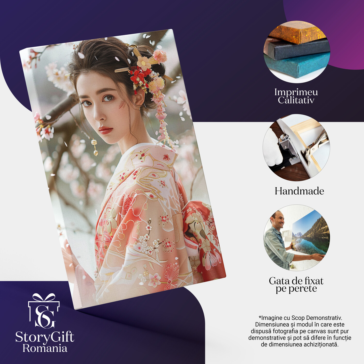 Tablou Canvas: Stilul Asiatic Kimono Floral Bruneta cu Parul Prins in Livada de Ciresi Pictura Digitala - Tablou Canvas Signature de la StoryGift Romania