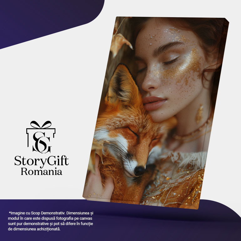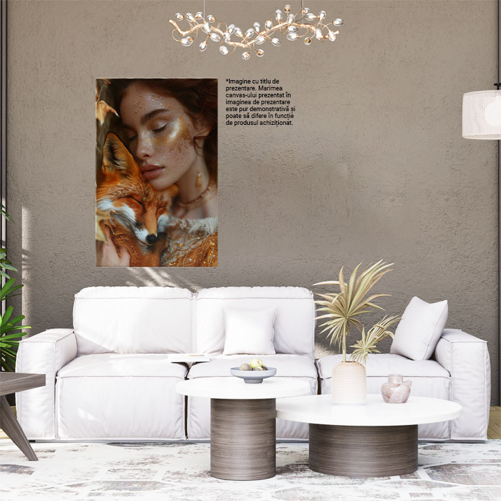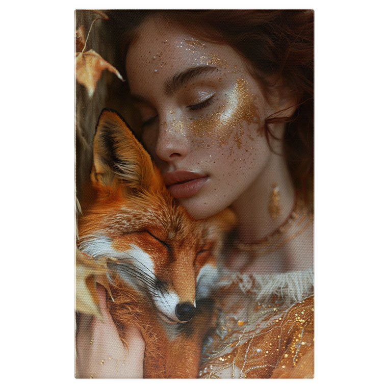 Tablou Canvas Animalul de Companie o Vulpe Frumoasa Alaturi de Stapana ei cu Sclipici pe Fata si Parul Roscat , Pictura Digitala 40x25CM