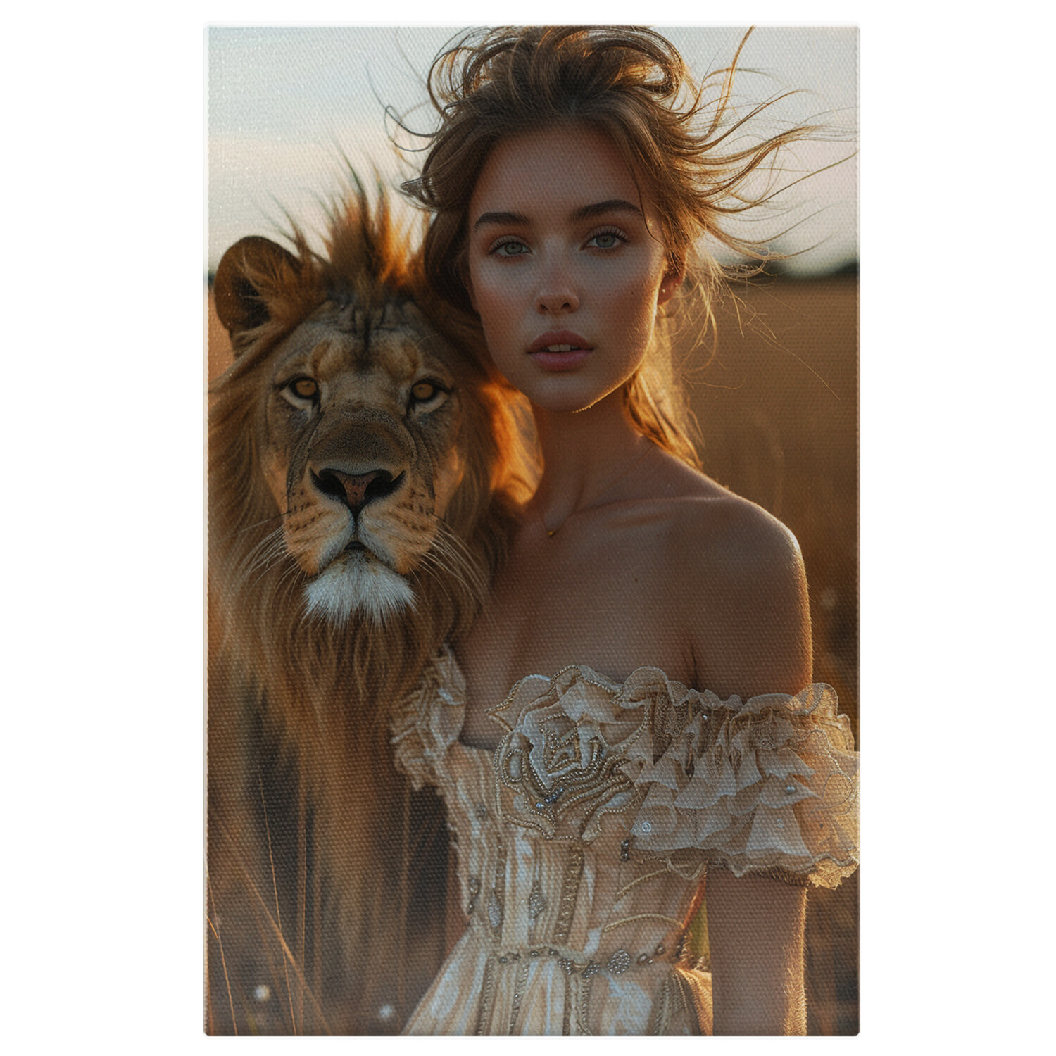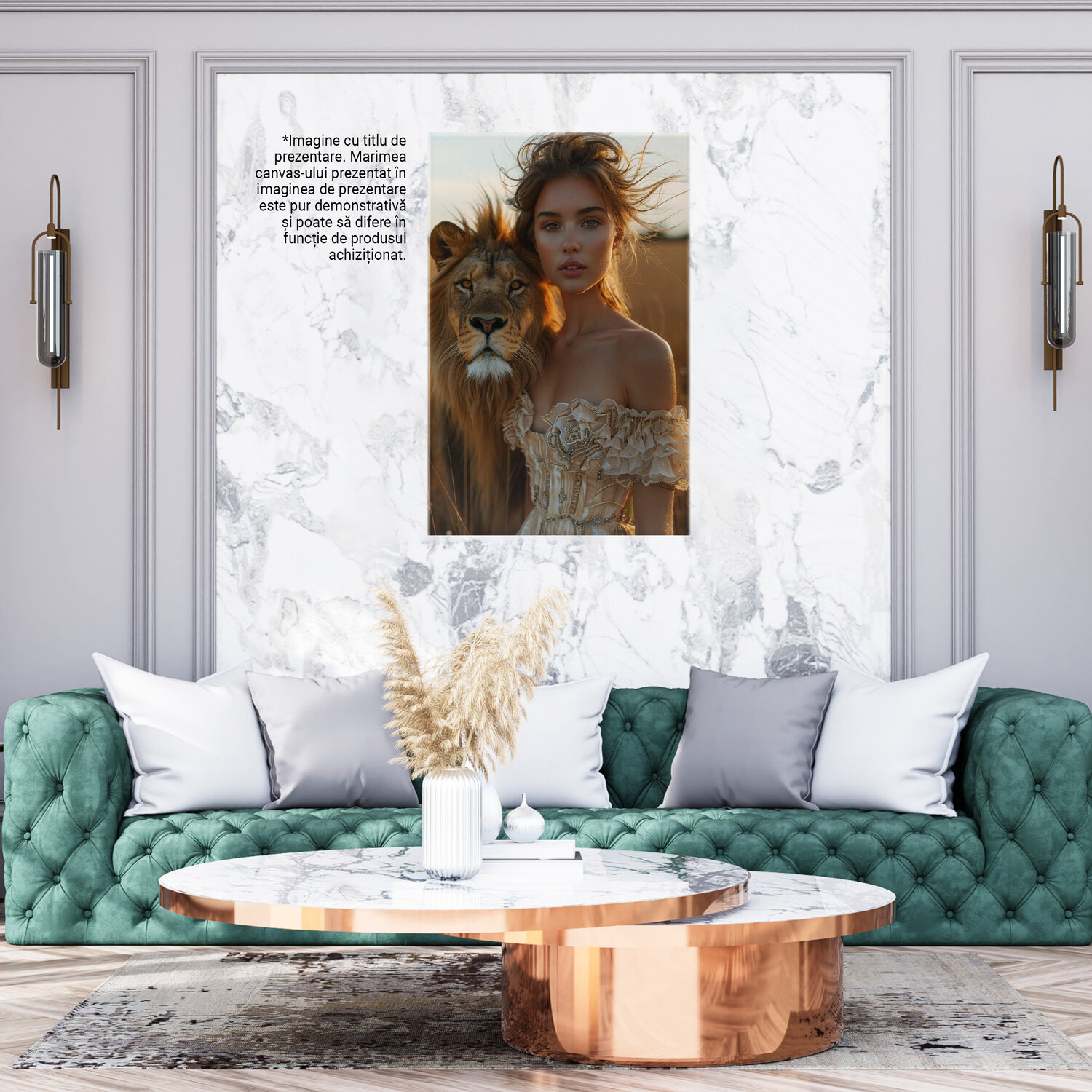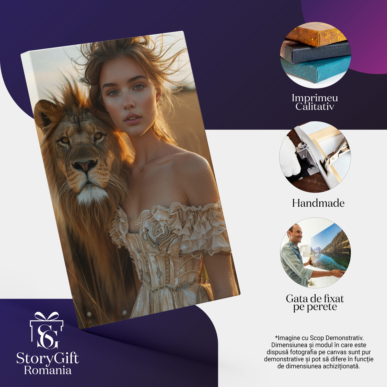 Tablou Canvas The Special Girl in Rochie Eleganta cu Umerii Goi Sprijinita de Fermecatorul Leu, Beautiful Girl , Pictura Digitala - Tablou Canvas Signature de la StoryGift Romania
