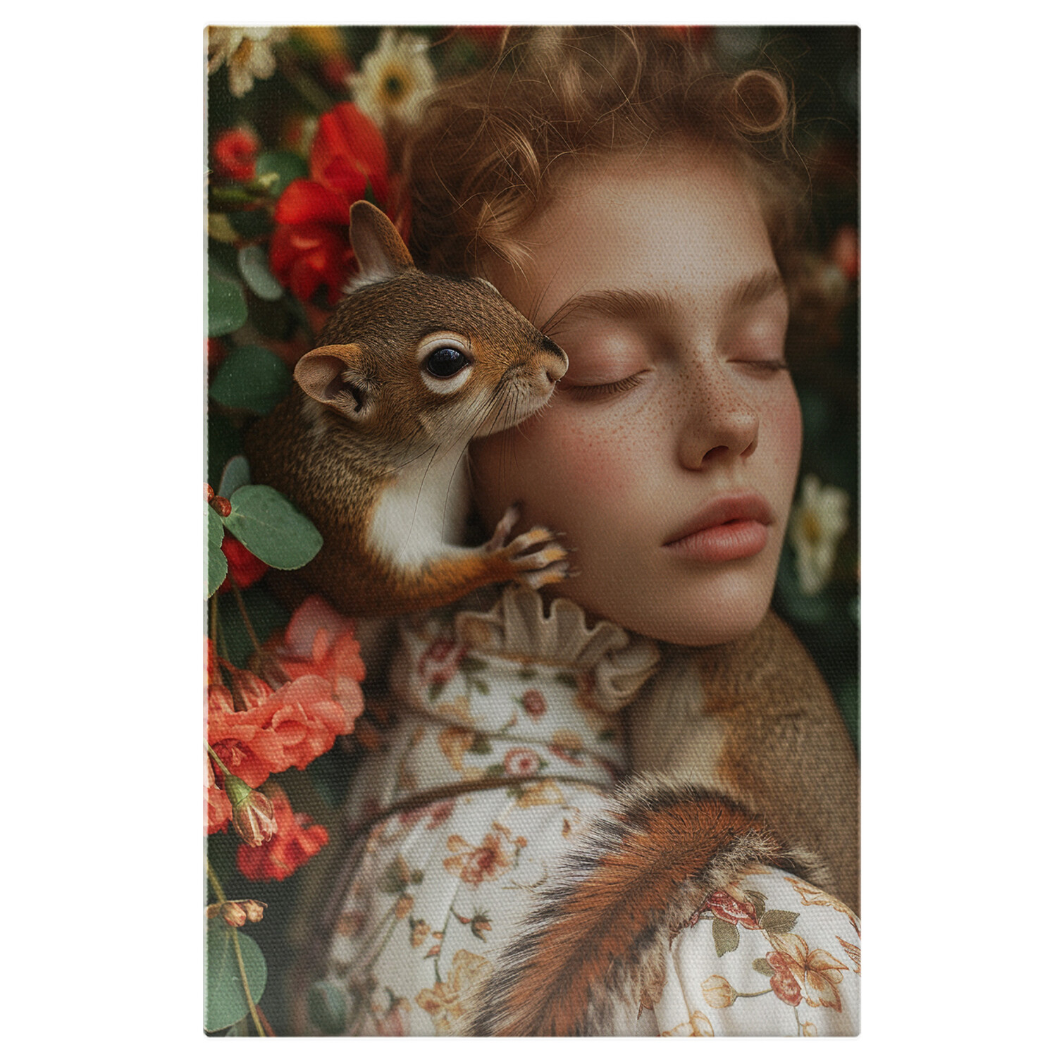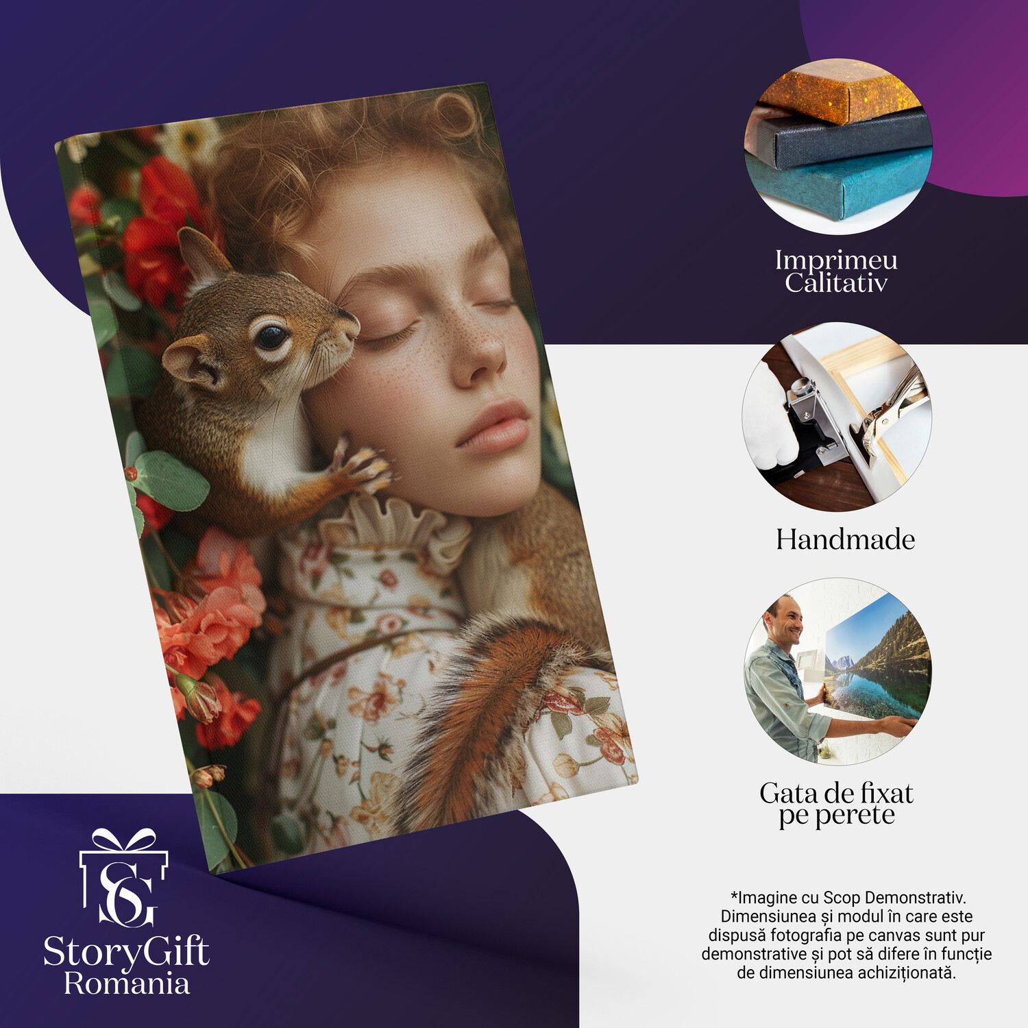 Tablou Canvas: Veverita Domestica si Fata cu Pistrui in Rochie cu Guler Gradina cu Pereti Florali Pictura Digitala - Tablou Canvas Signature de la StoryGift Romania