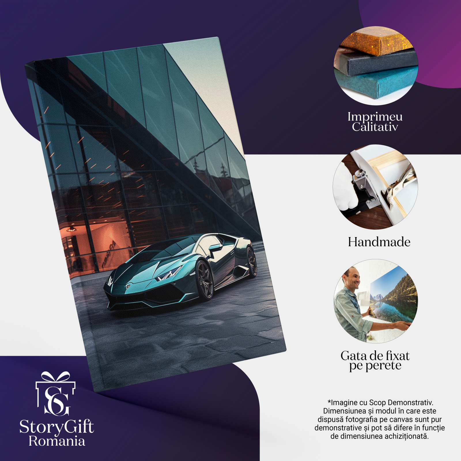 Tablou Canvas: Lamborghini in fata unei cladiri - prezentare autovehicul scump Pictura Digitala 40x25CM - Tablou Canvas Signature de la StoryGift Romania