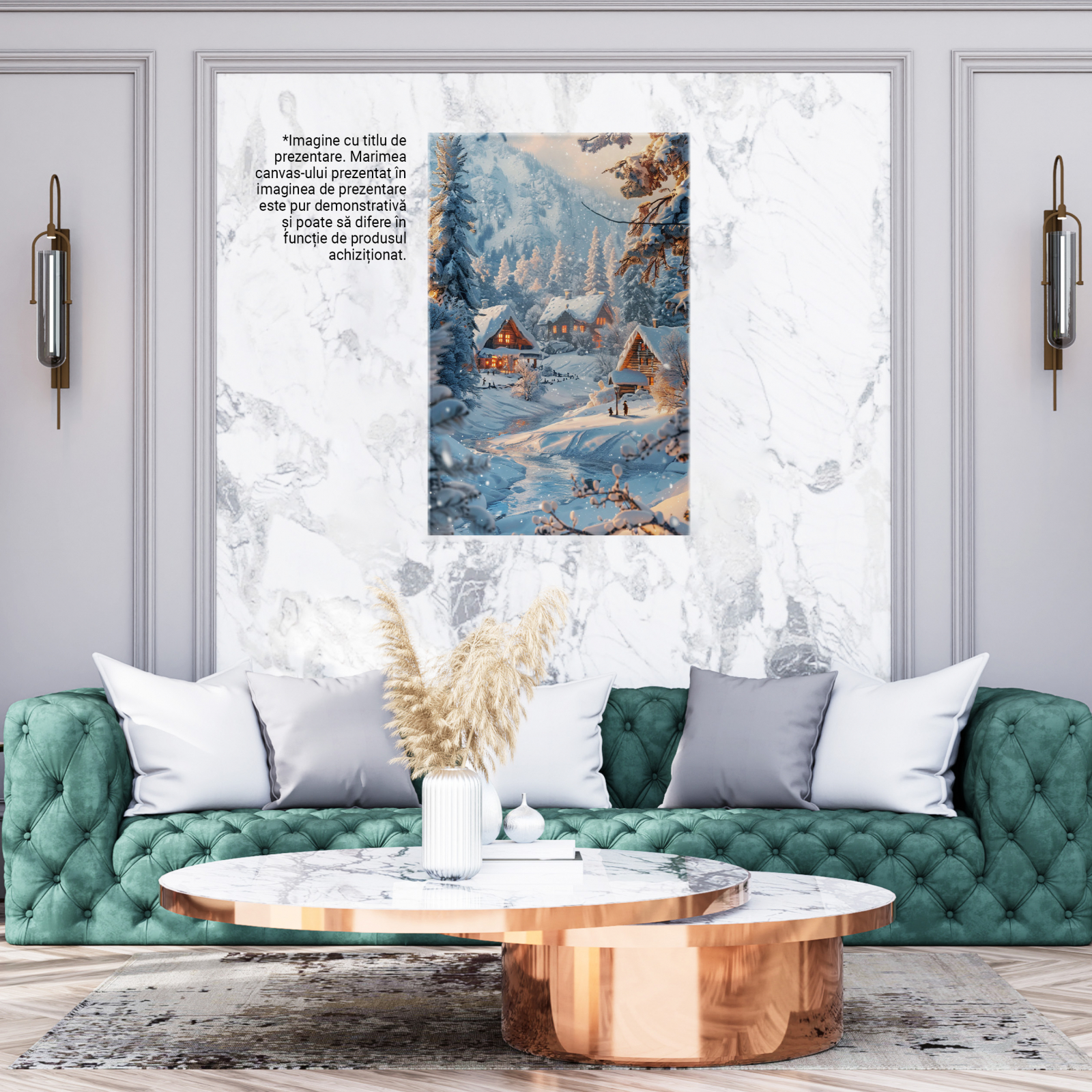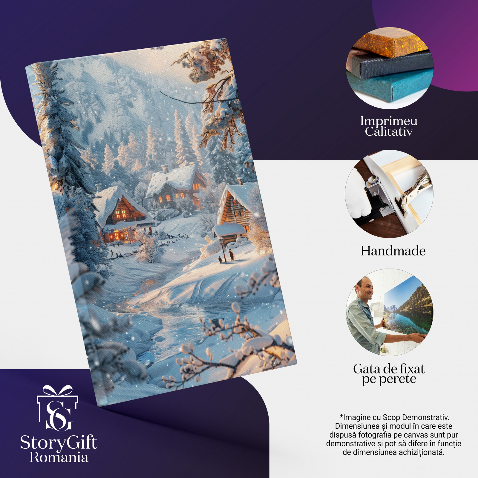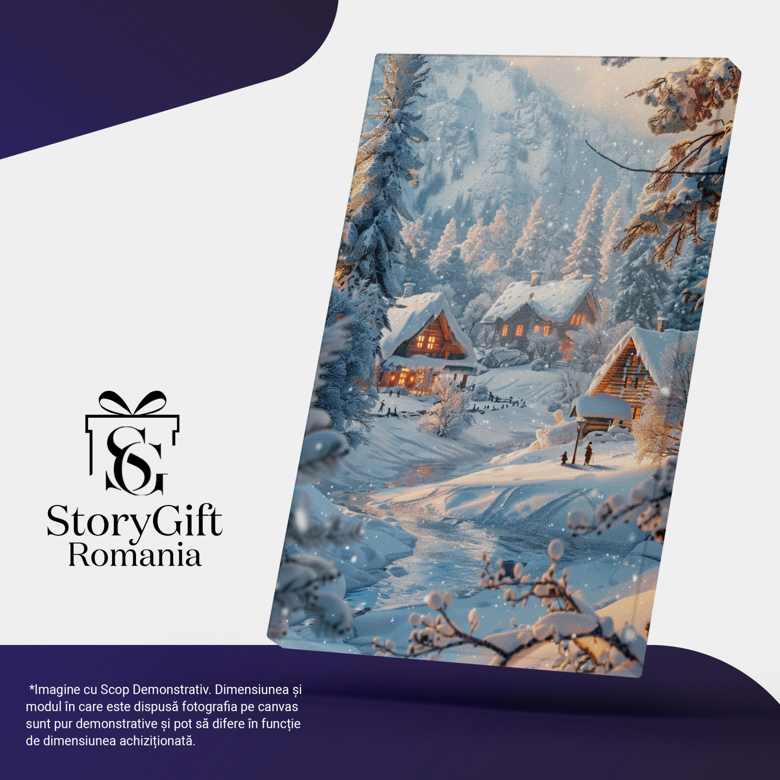 Tablou Canvas: Peisaj de Iarna cu Casute Inzapezite si Luminate, Brazi - Fotografie Artistica si Anotimp Rece Pictura Digitala 60x40CM - Tablou Canvas Signature de la StoryGift Romania