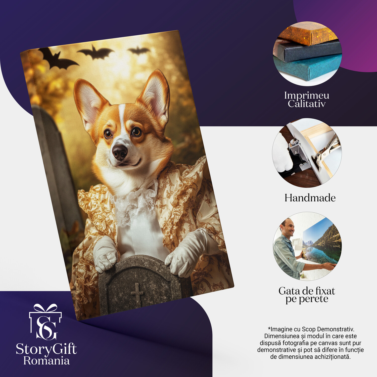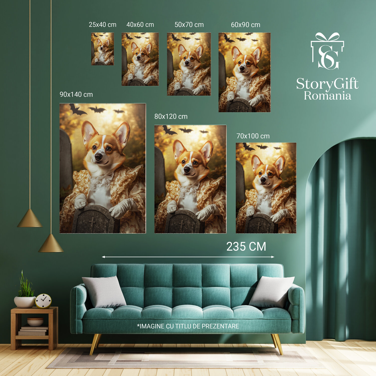 Tablou Canvas Personalizat Noapte de Hallowen in cimitir, Tinuta eleganta regala Galbena cu detalii aurii, colindat, lilieci, filme horror sarbatoare 40x25CM