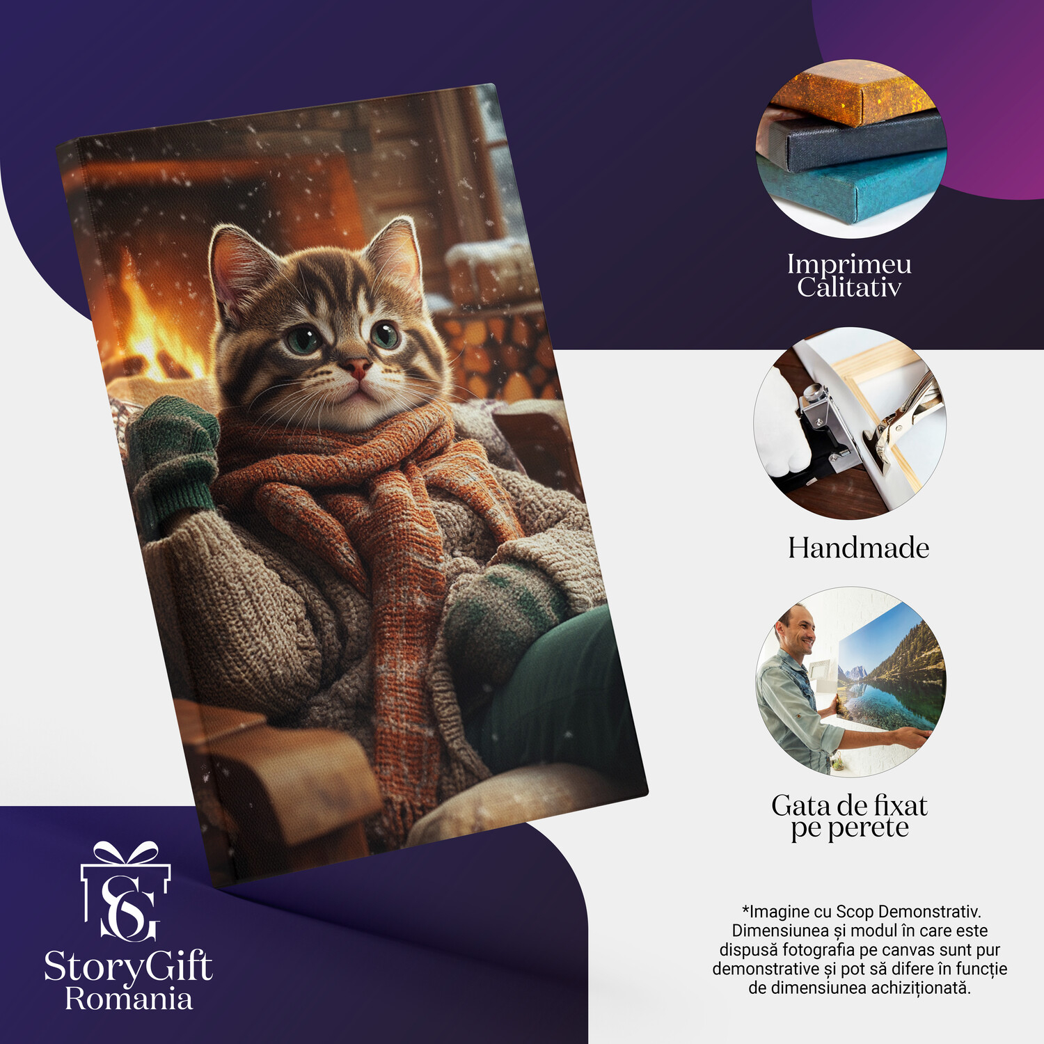 Tablou Canvas Personalizat Portret casnic modern, relaxare in zilele Craciunului, tinuta crosetata din lana, fular pulover, fotoliu semineu 40x25CM