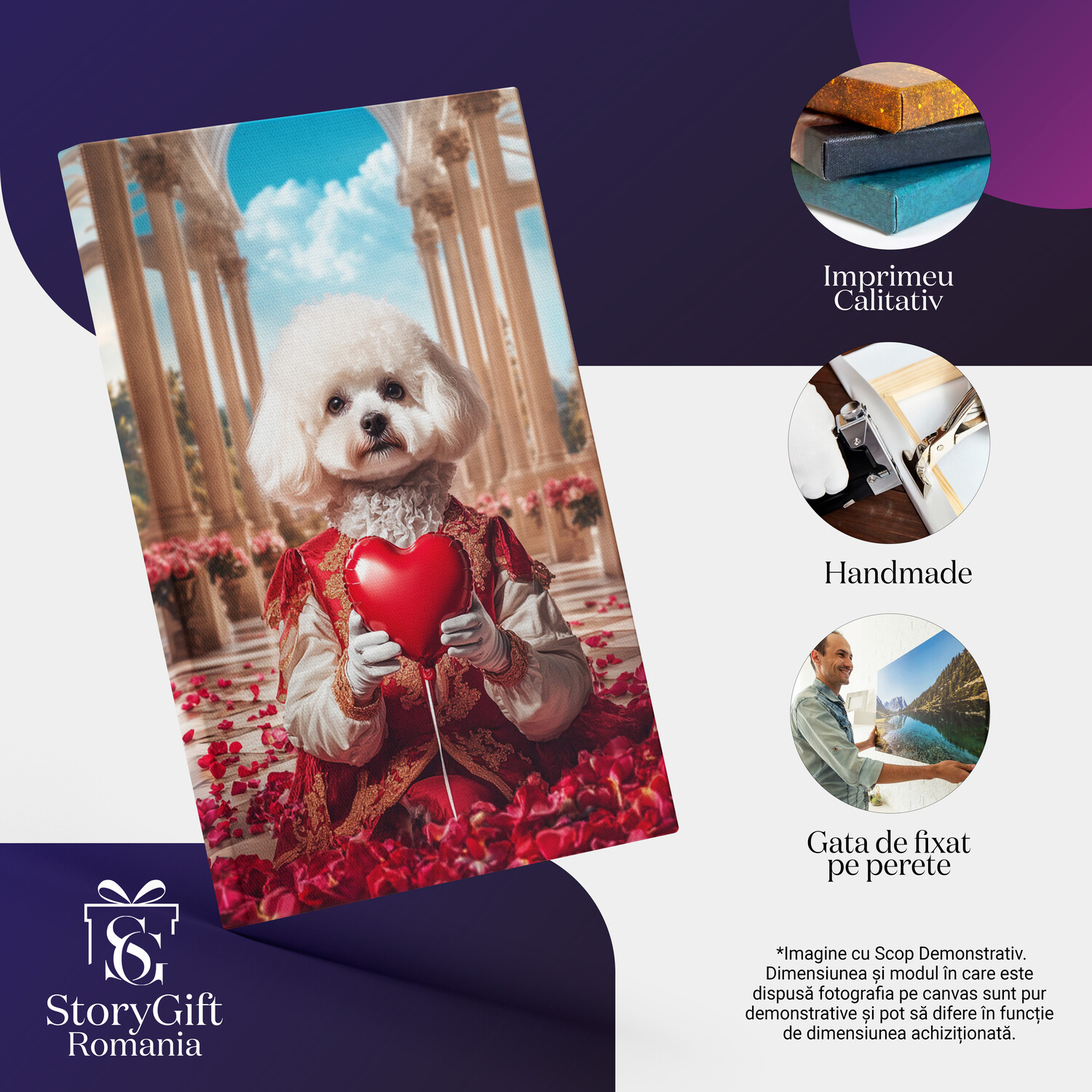 Tablou Canvas Personalizat Portret conte regal in petale de trandafir rosu, sarbatoare romantica Valentine's Day, balon in forma de inima, ziua indragostitilor 40x25CM