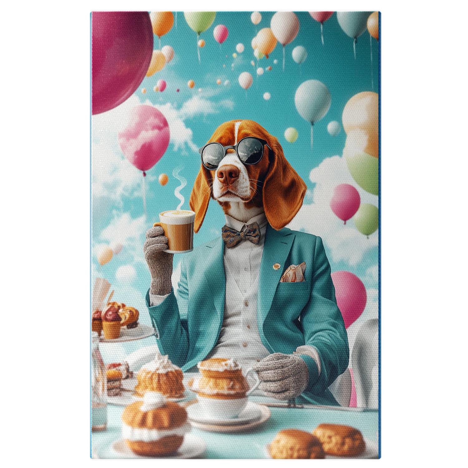 Tablou Canvas Personalizat Zi onomastica, tinuta eleganta albastra, papion, diverse baloane vibrante, salbatoare zi de nastere 40x25CM